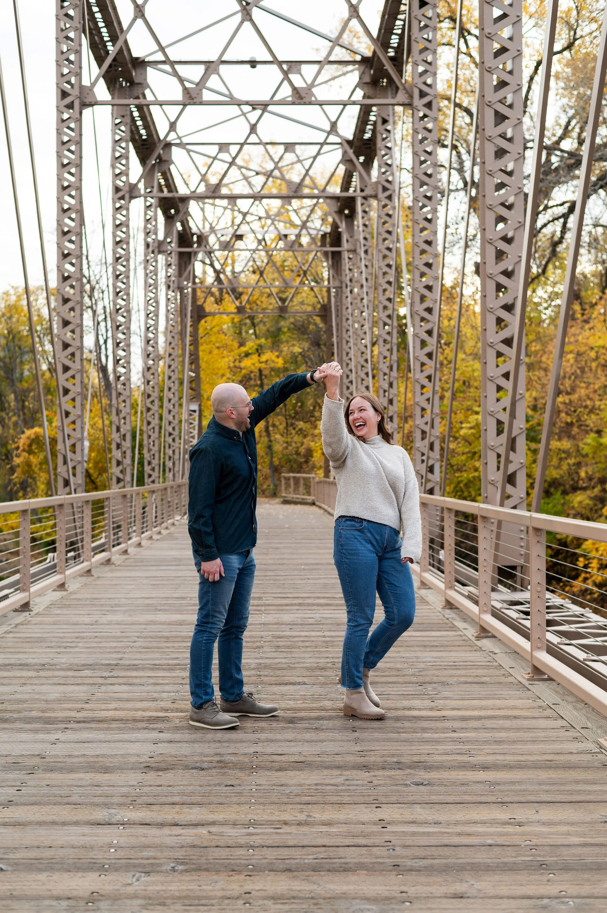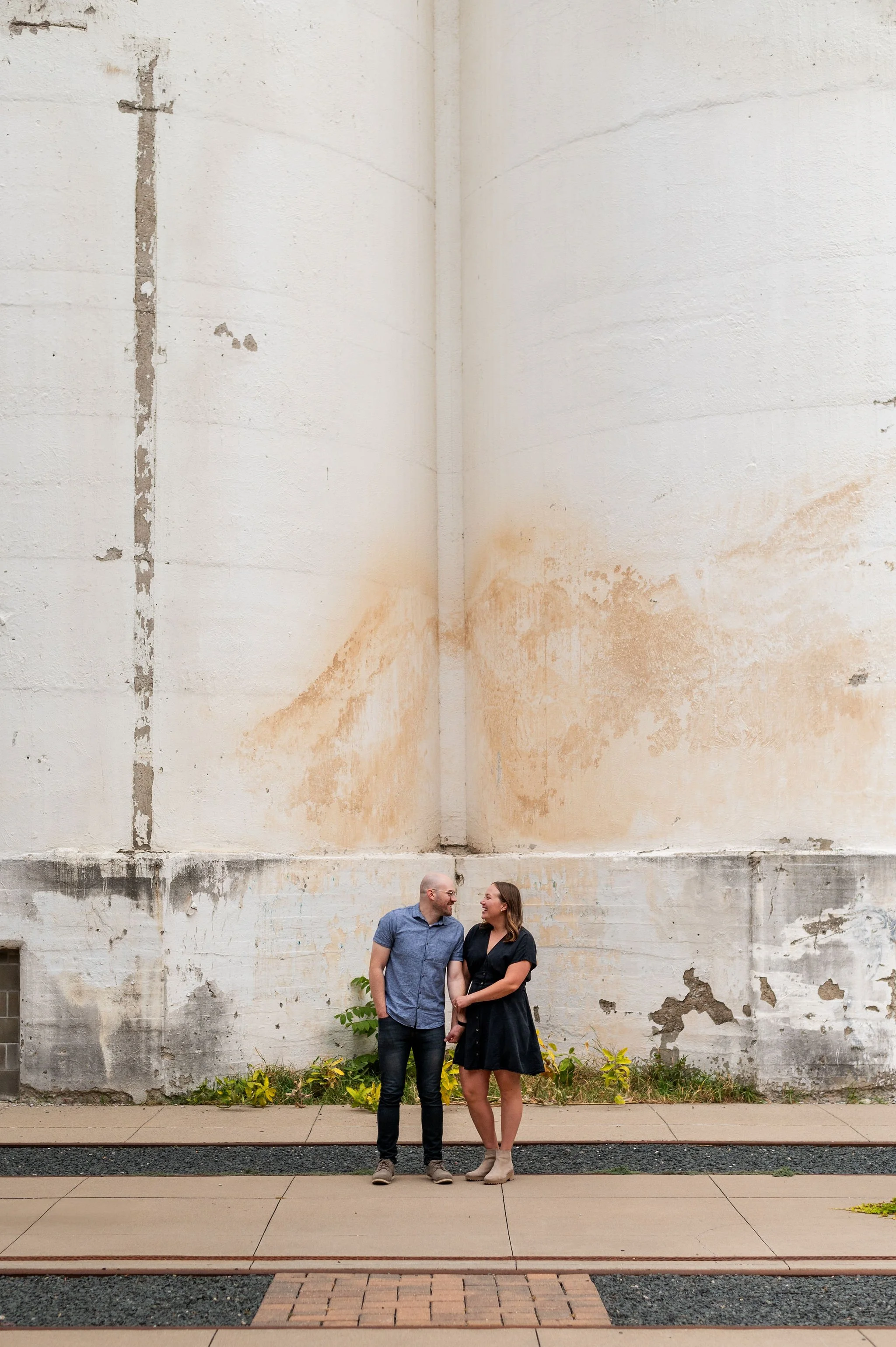 After exploring Boom Island, we meandered over to St. Anthony Main, taking our time to enjoy the slower pace of a quiet morning downtown. The cobblestone streets and historic architecture offered a classic yet cozy backdrop that perfectly complemented the season. Kate and Dave were all about soaking in the moment, whether it was strolling hand-in-hand or pausing to take in the beauty around them.