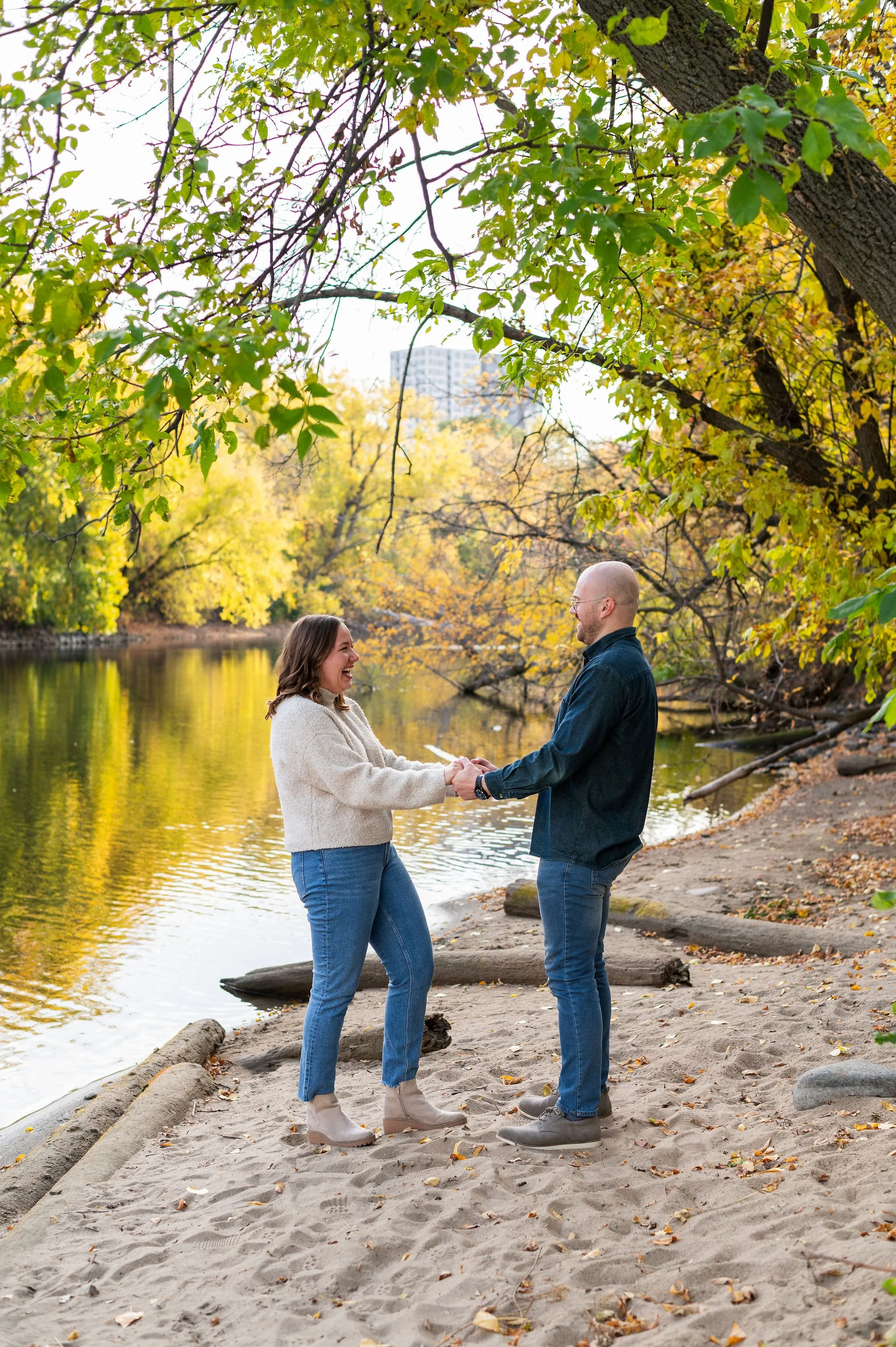 There’s something magical about fall mornings in Minneapolis, and Kate and Dave’s engagement session captured all of that crisp, cozy charm. We started our day at Boom Island Park, where the golden leaves and quiet paths set the tone for an intimate and relaxed session. With the Minneapolis skyline in the background and the Mississippi River nearby, it was the perfect place to begin documenting Kate and Dave’s love story.