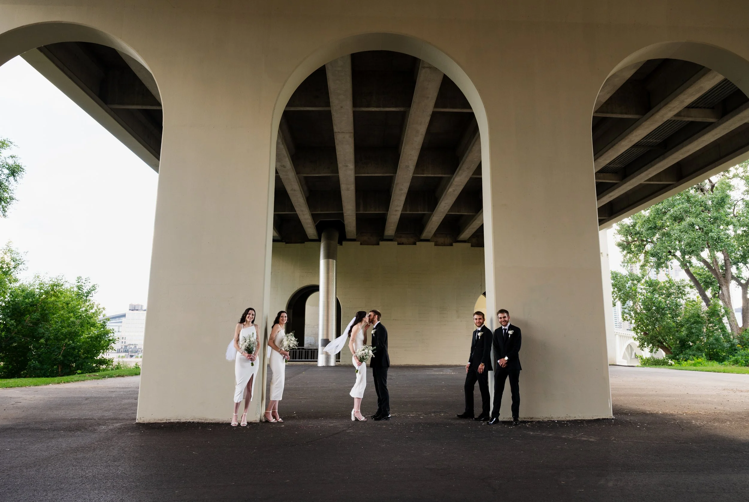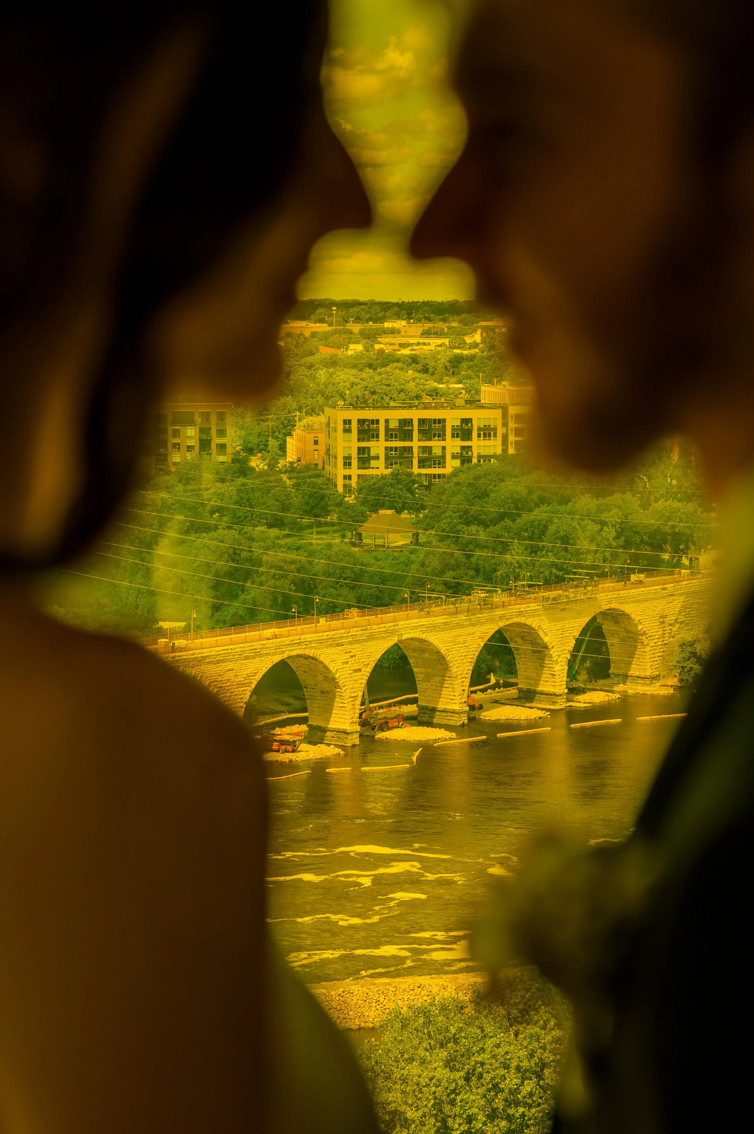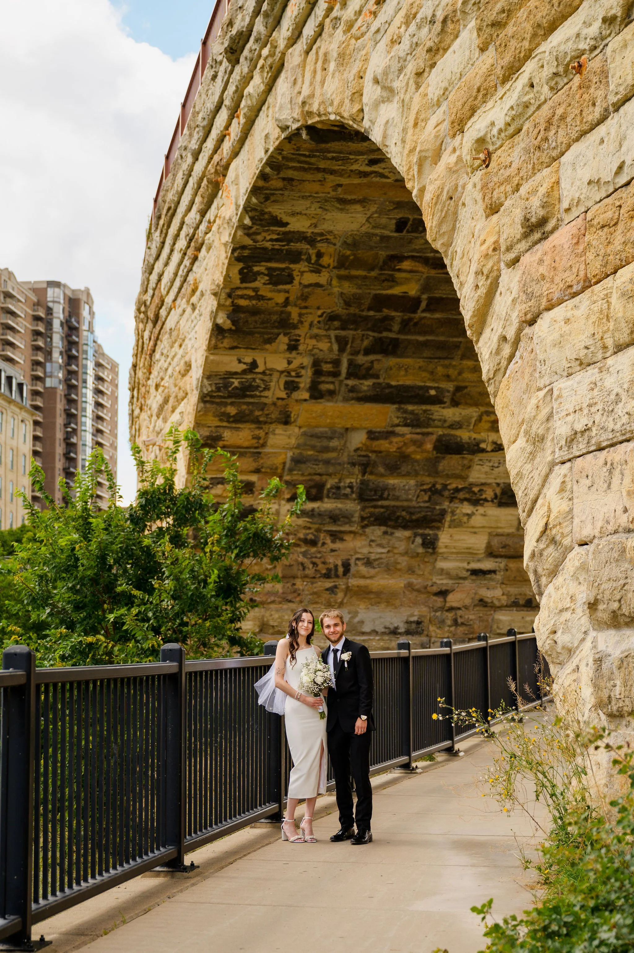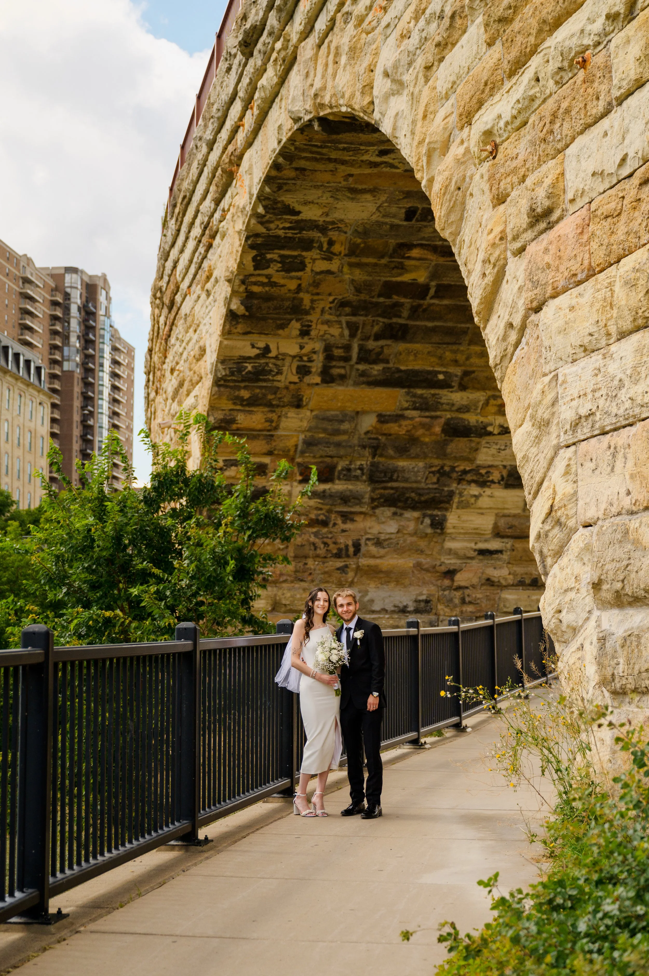 We took the majority of their portraits before their vow exchange. I think I speak for our little group when I say our stop at the Guthrie was the highlight from the portrait section of the afternoon. From the yellow observation room, we could spot the exact gazebo where they were to be married in just a couple of hours. It sat neatly across the river, framed by canopies, floating above the Stone Arch Bridge.