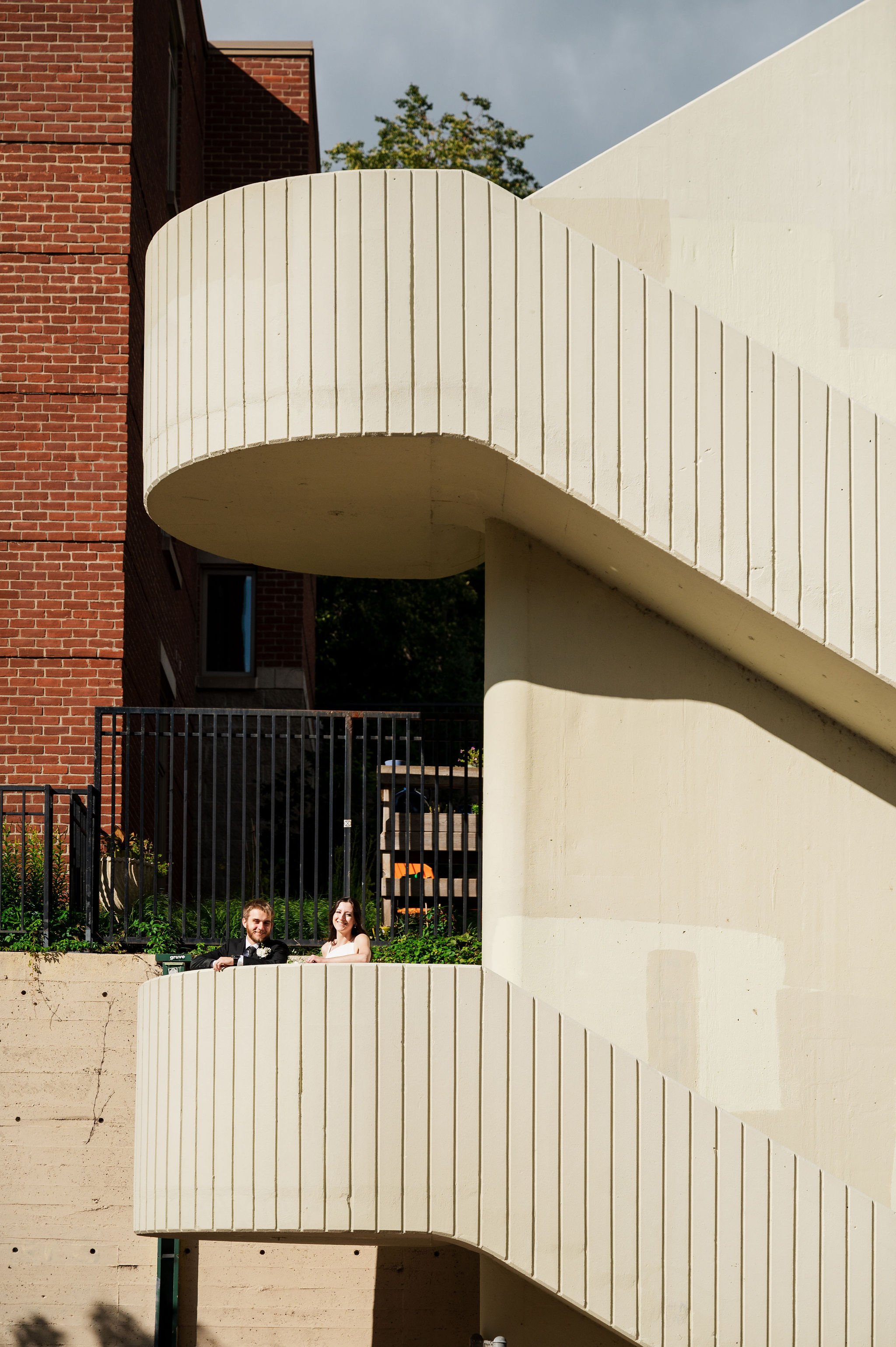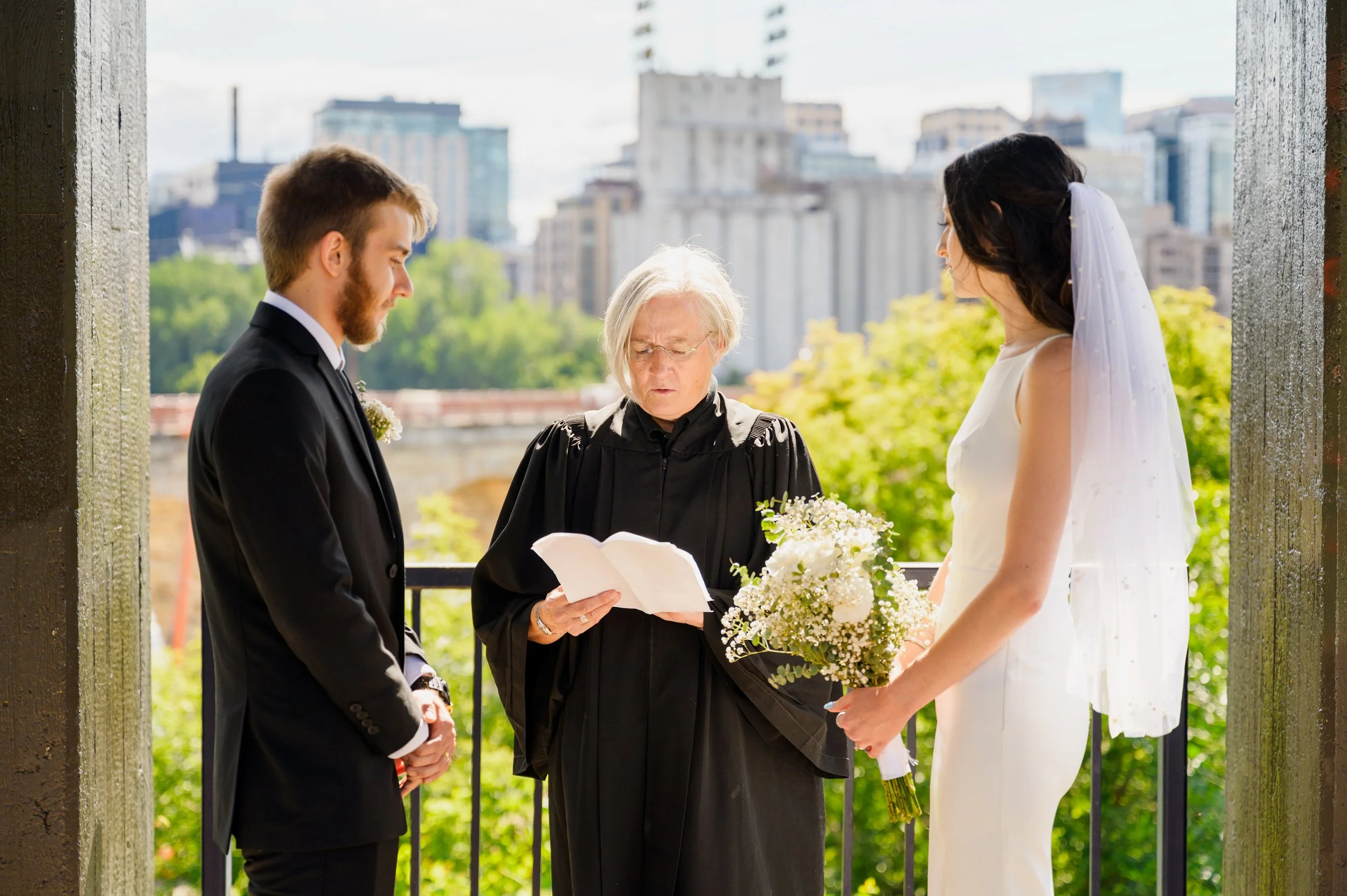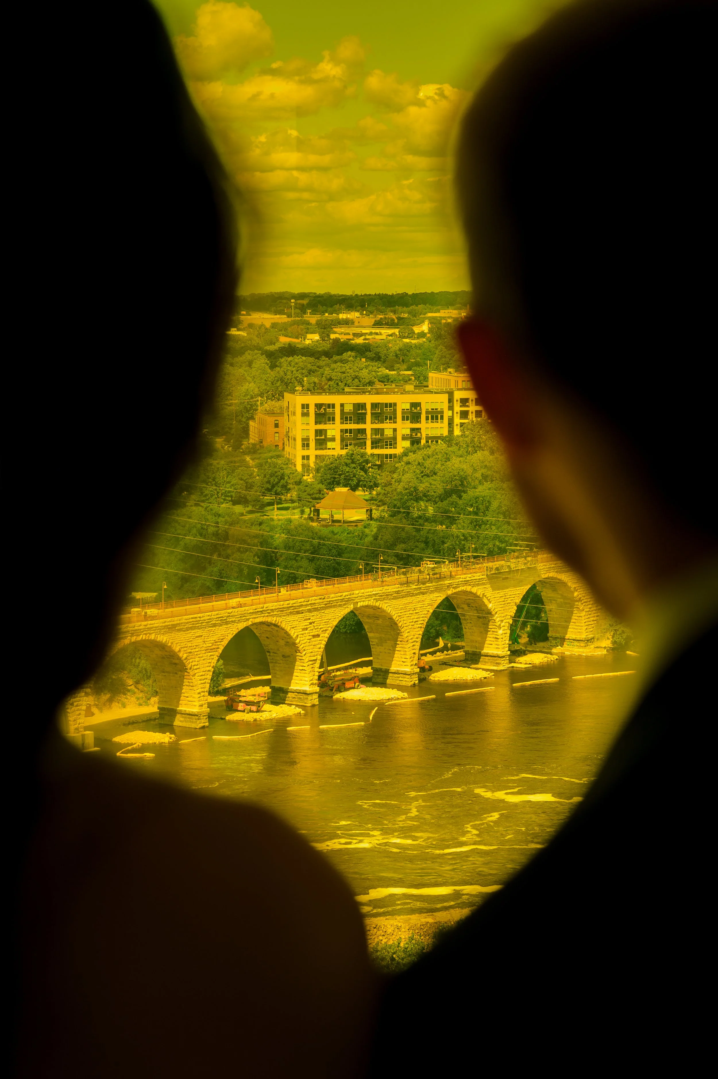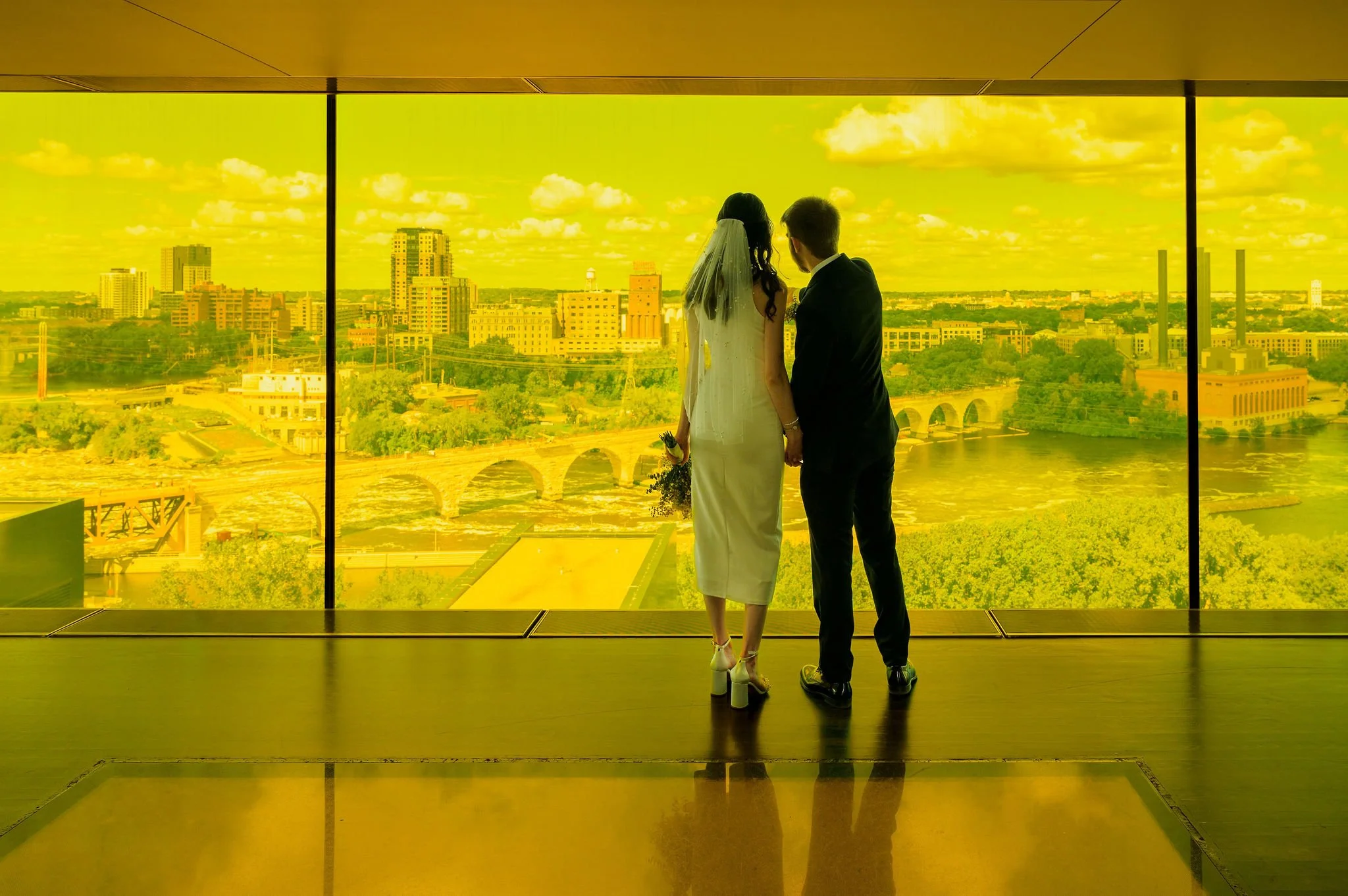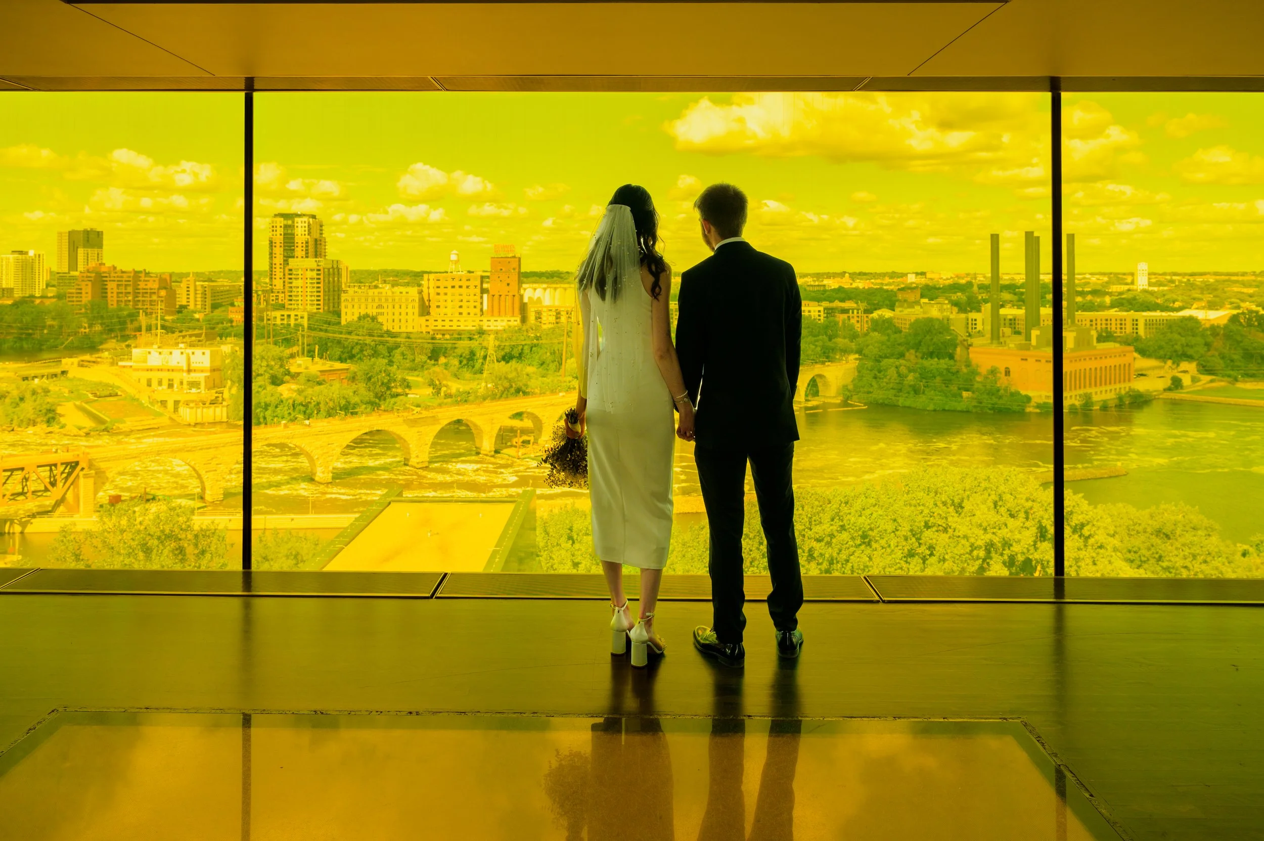 We took the majority of their portraits before their vow exchange. I think I speak for our little group when I say our stop at the Guthrie was the highlight from the portrait section of the afternoon. From the yellow observation room, we could spot the exact gazebo where they were to be married in just a couple of hours. It sat neatly across the river, framed by canopies, floating above the Stone Arch Bridge.