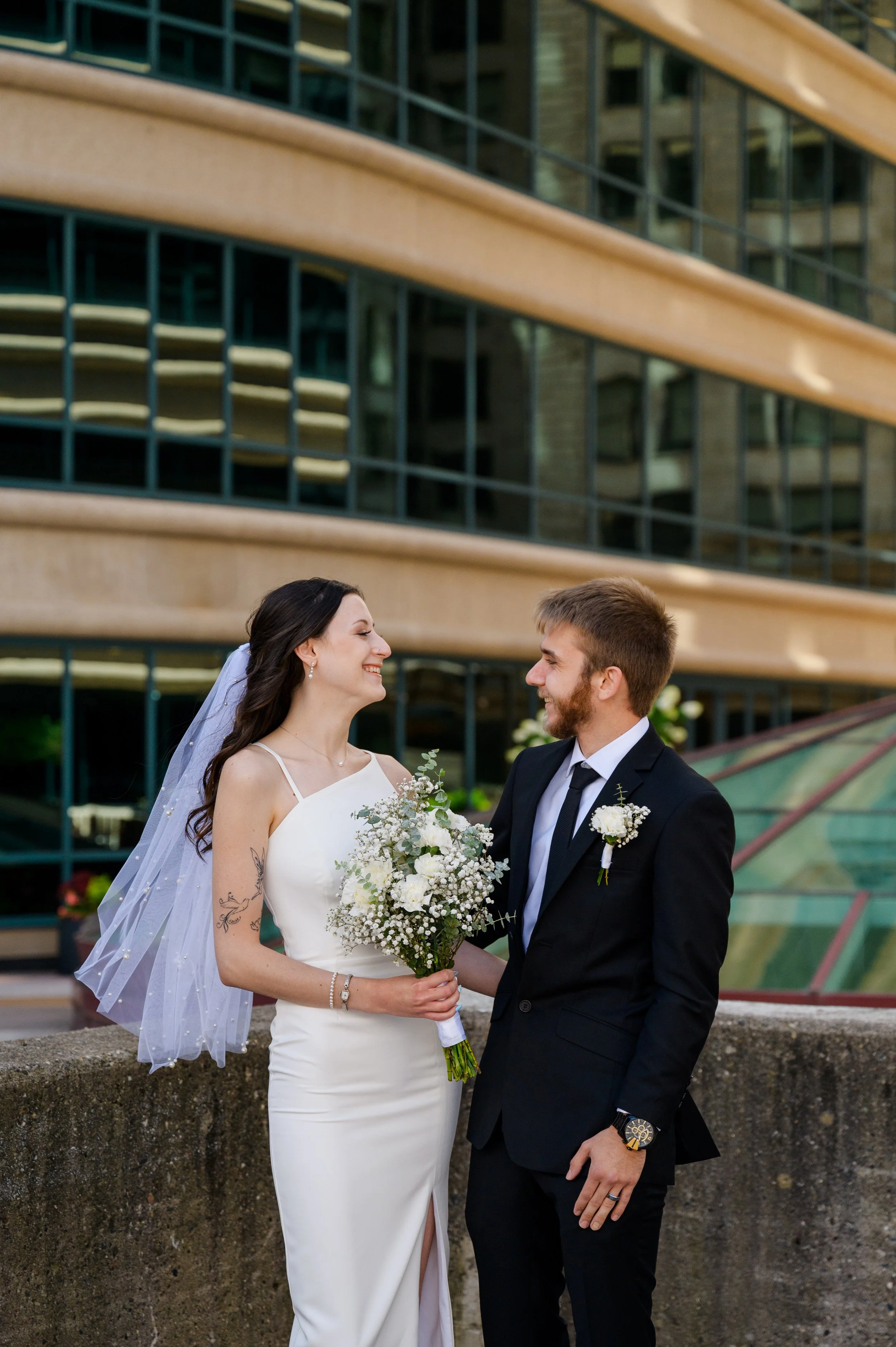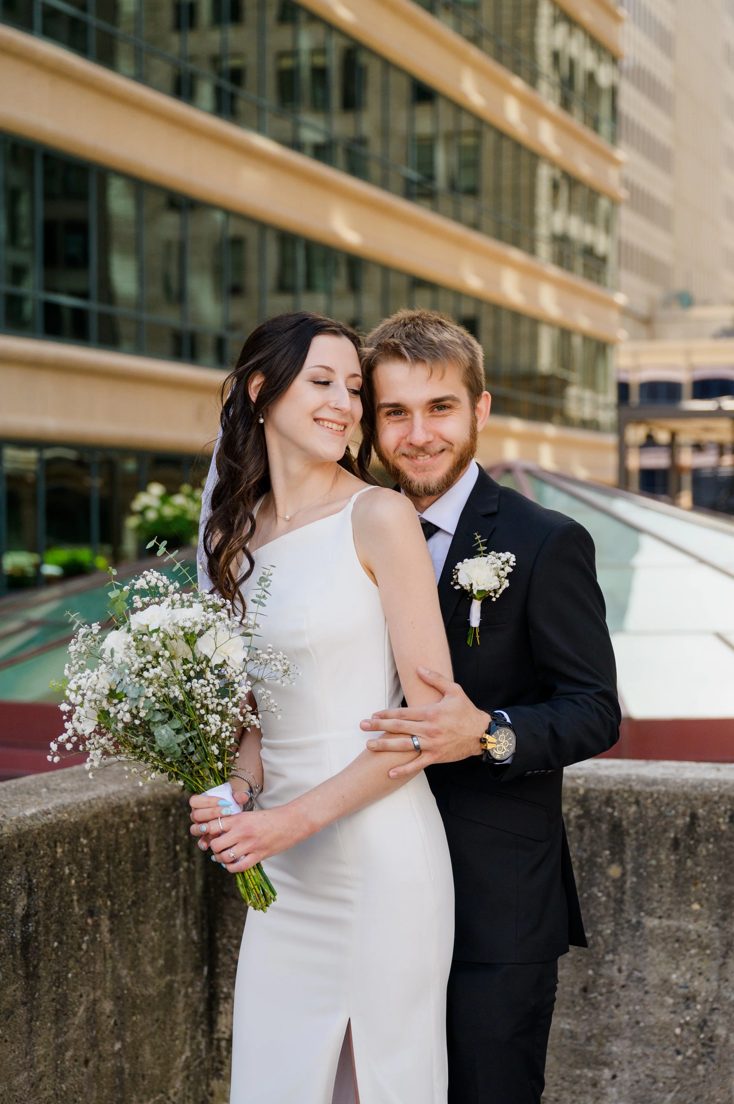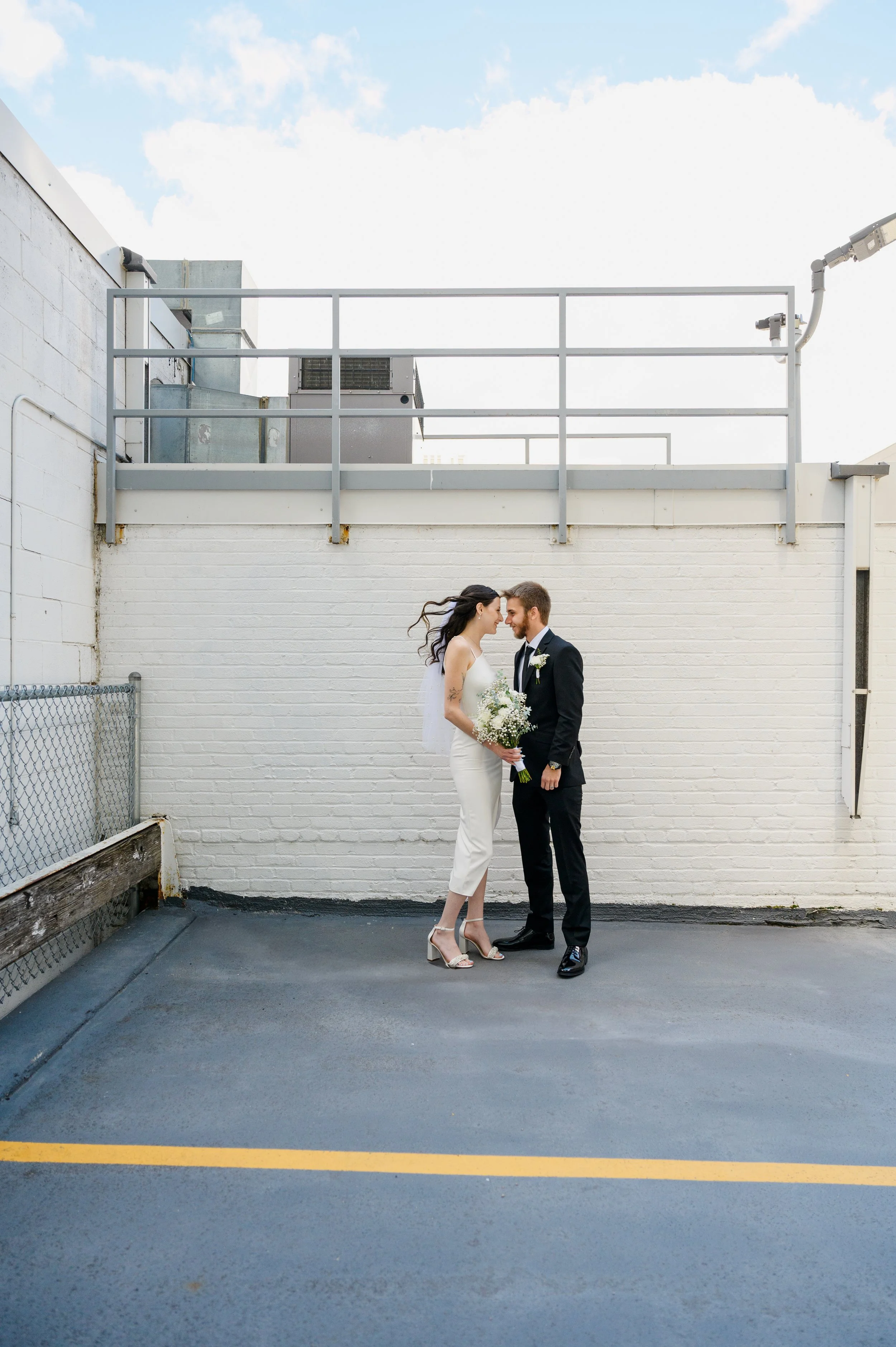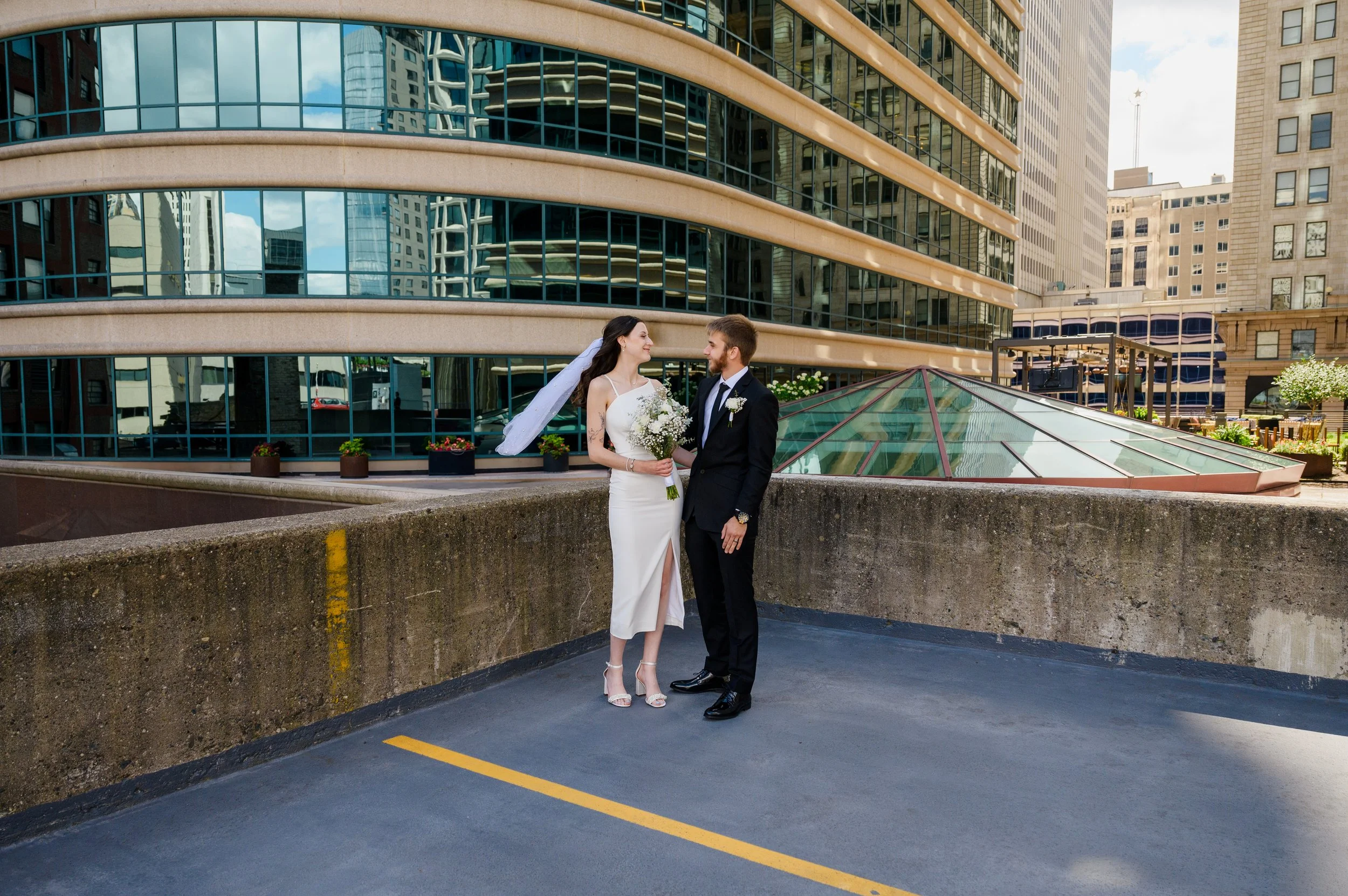 This was my first elopement in Downtown Minneapolis, and I really hope it’s not my last! I had so much fun planning the timeline for this day with Angela. She was so sweet and fun to talk over ideas with. She sent me her Pinterest board with a specific vision and we agreed on several locations scattered across Downtown. We met at the top of a parking garage in Minneapolis on the day of their elopement. Her and Ryan were high school sweethearts and their plans included him departing for the Air Force sooner rather than later. I hadn’t met them in person before this, but they were so sweet and excited and in love that posing and photographing them came easy.