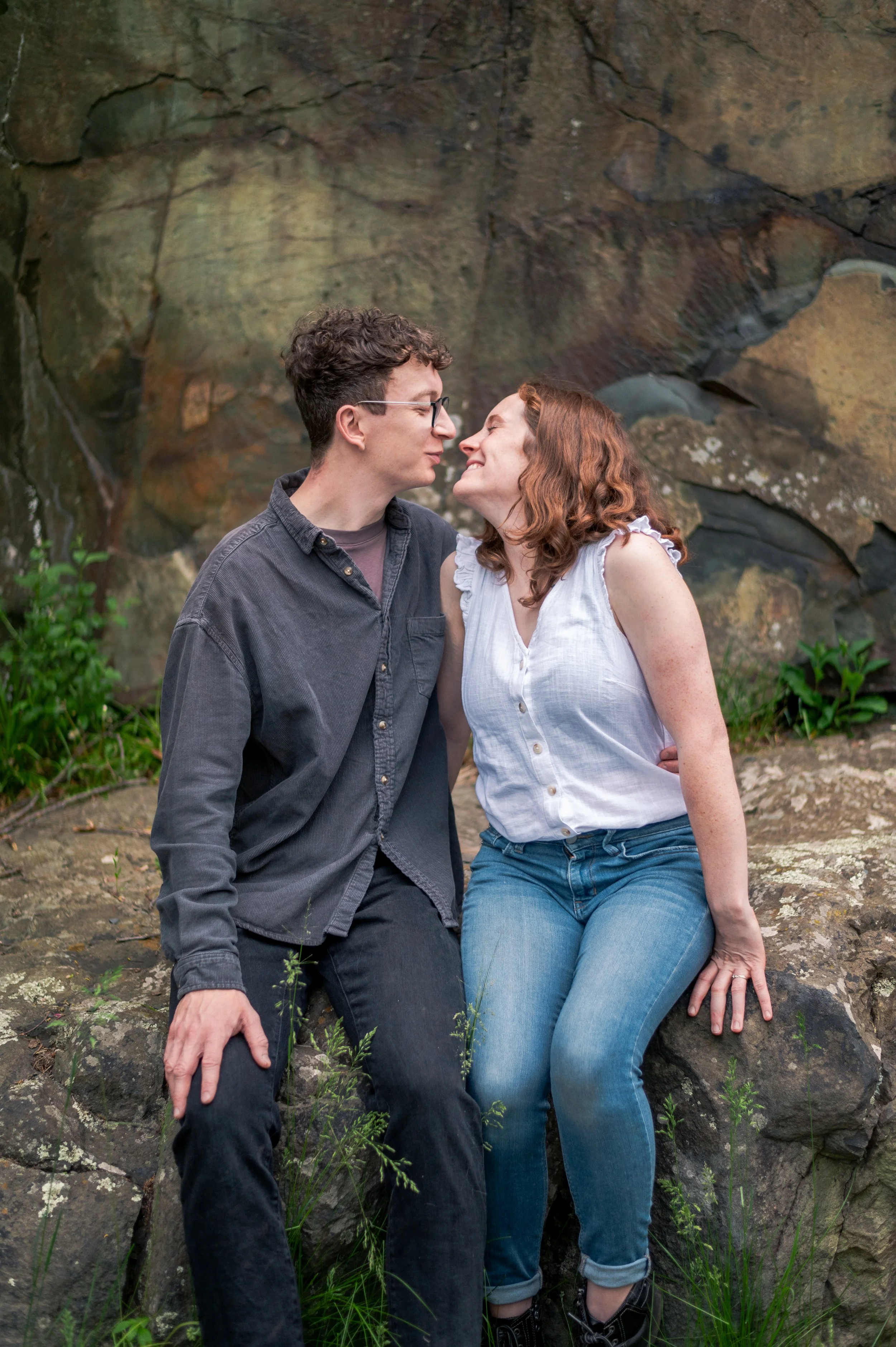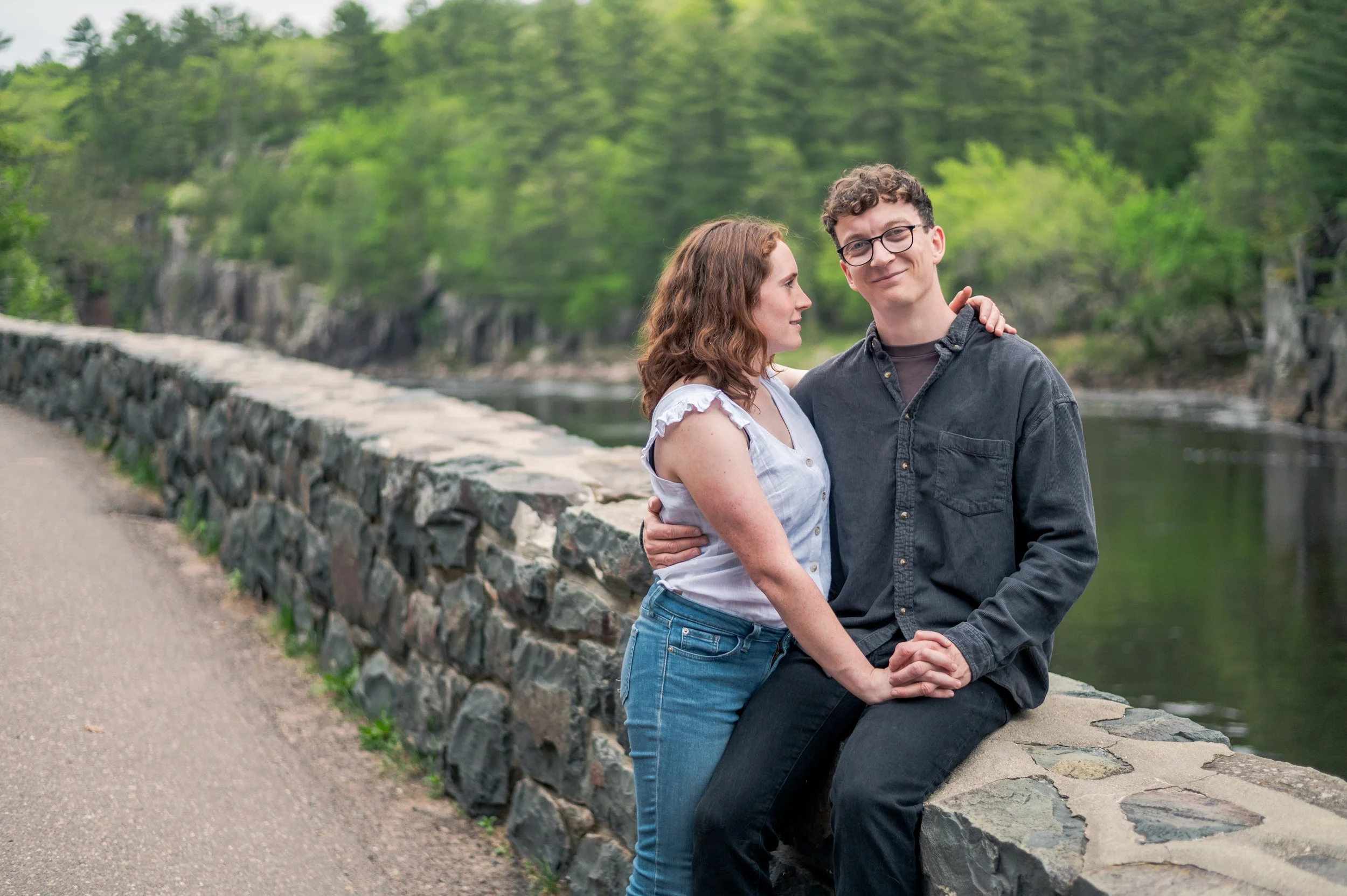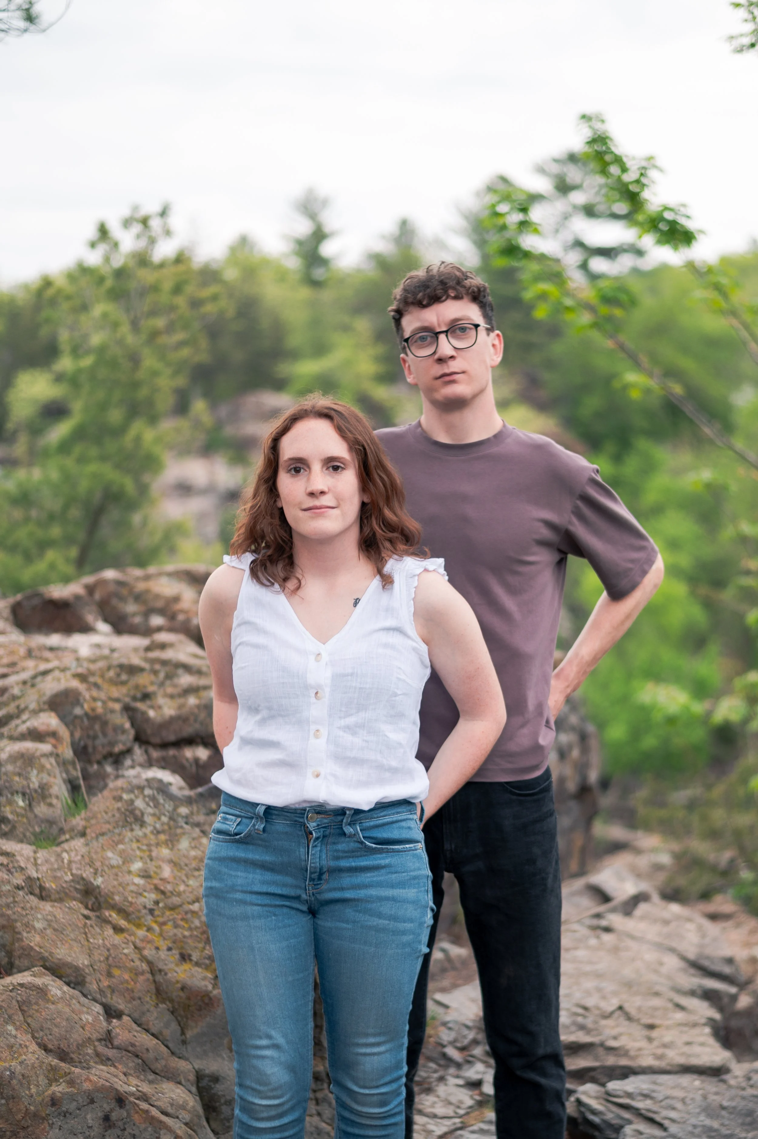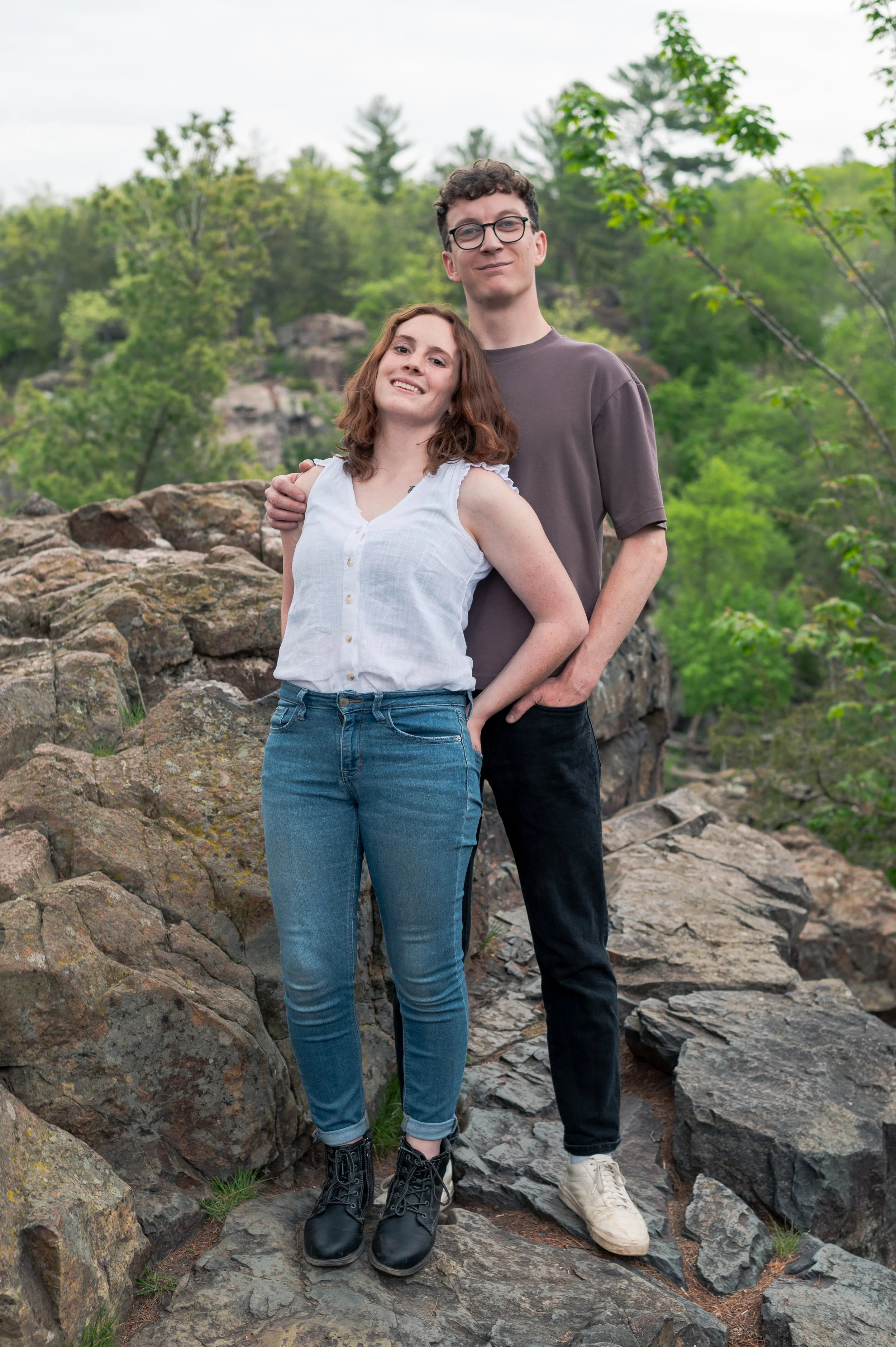 Skyler and Josh chose Interstate State Park for their engagement session. It was mid-July and there had just been a ton of rain, so we were unfortunately battling monstrously huge mosquitoes the entire time we hiked the bluffs (I can confidently say I’ve never seen mosquitoes this big, they may as well have been flies!) but these two were troopers throughout the whole ordeal. Josh, having just moved here from the UK, began developing small welts from the bites so we hustled over to the visitor center. Thankfully they relented once we arrived at the glacial potholes. We explored the nooks and crannies around us, finding pockets of quiet spaces all to ourselves despite the lot being quite full.