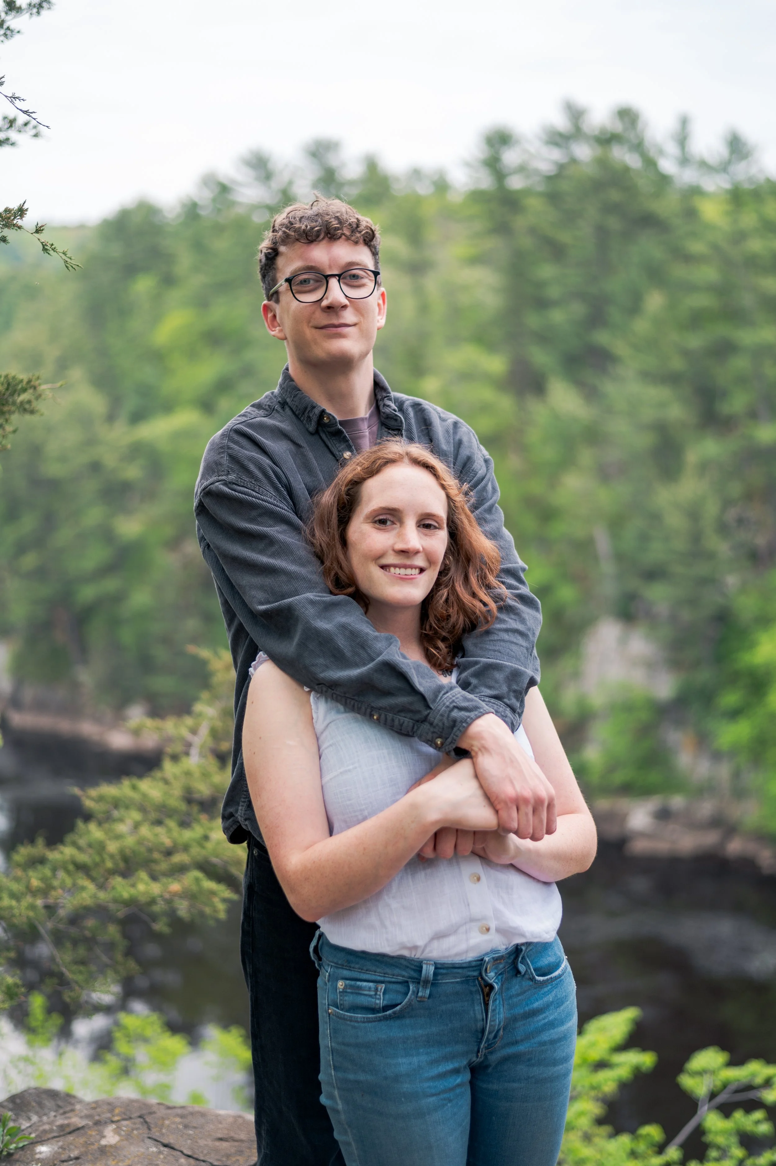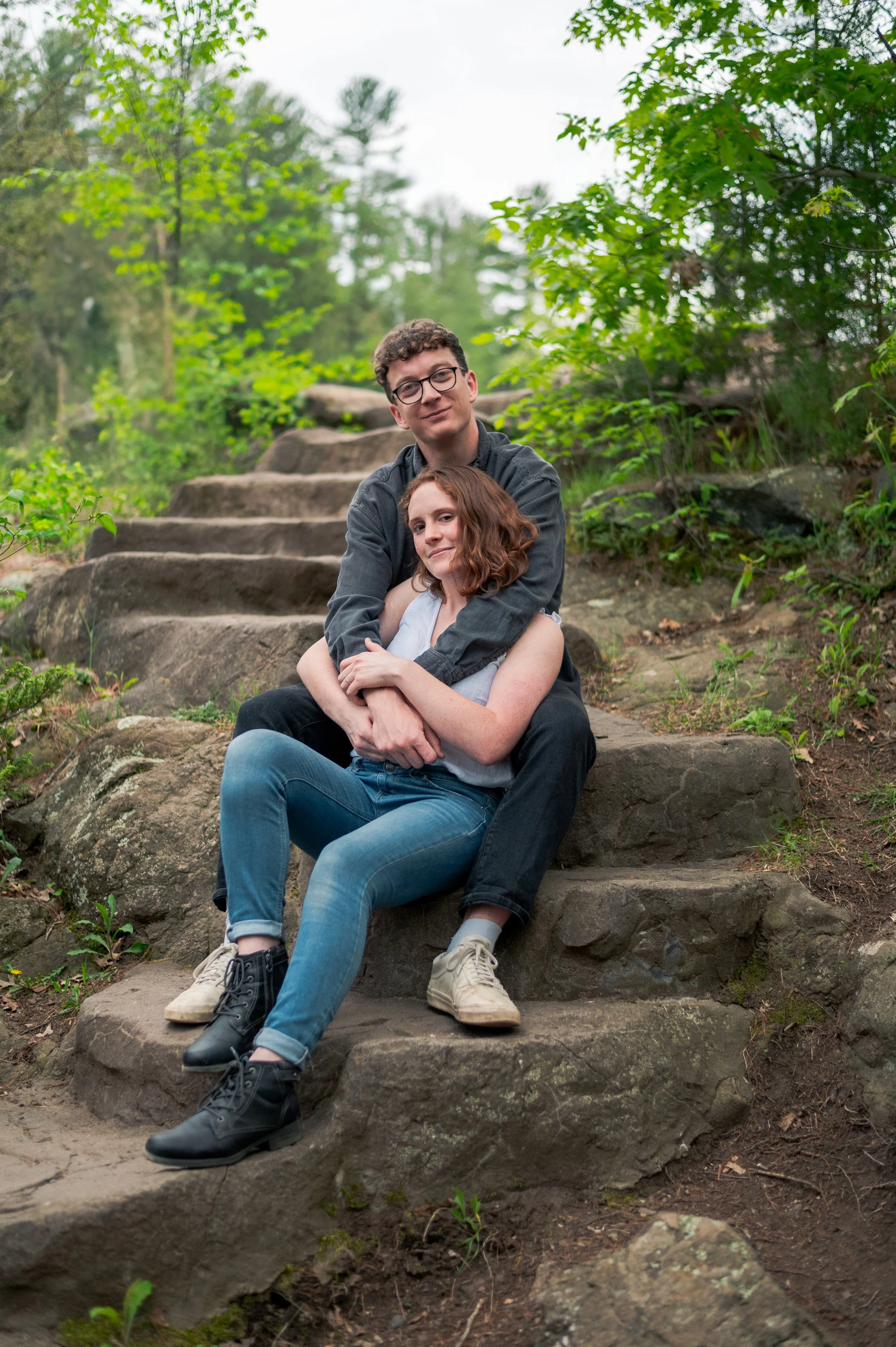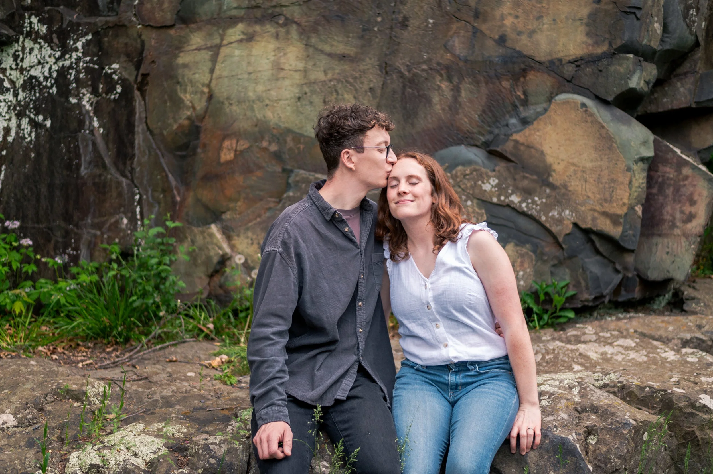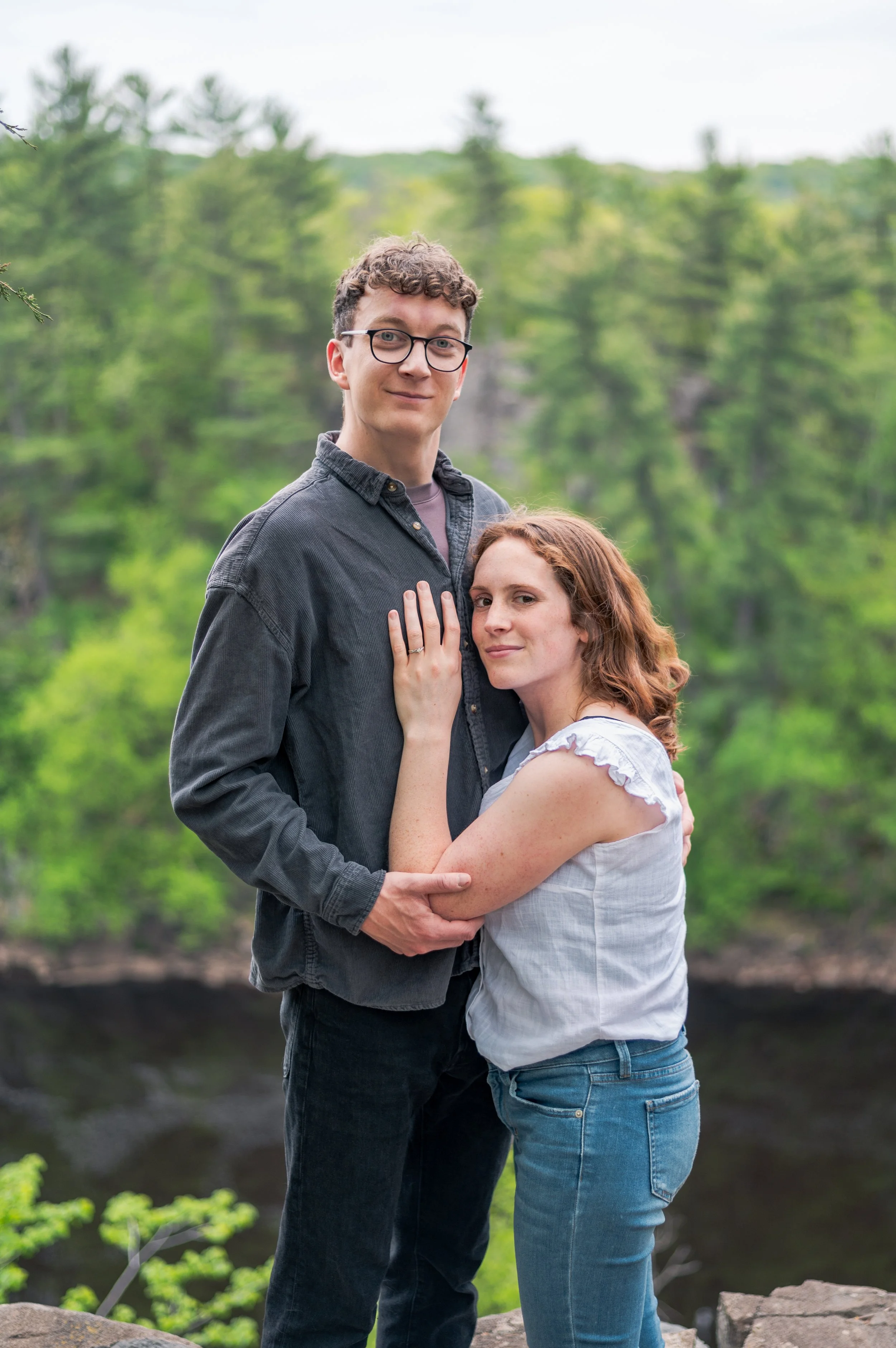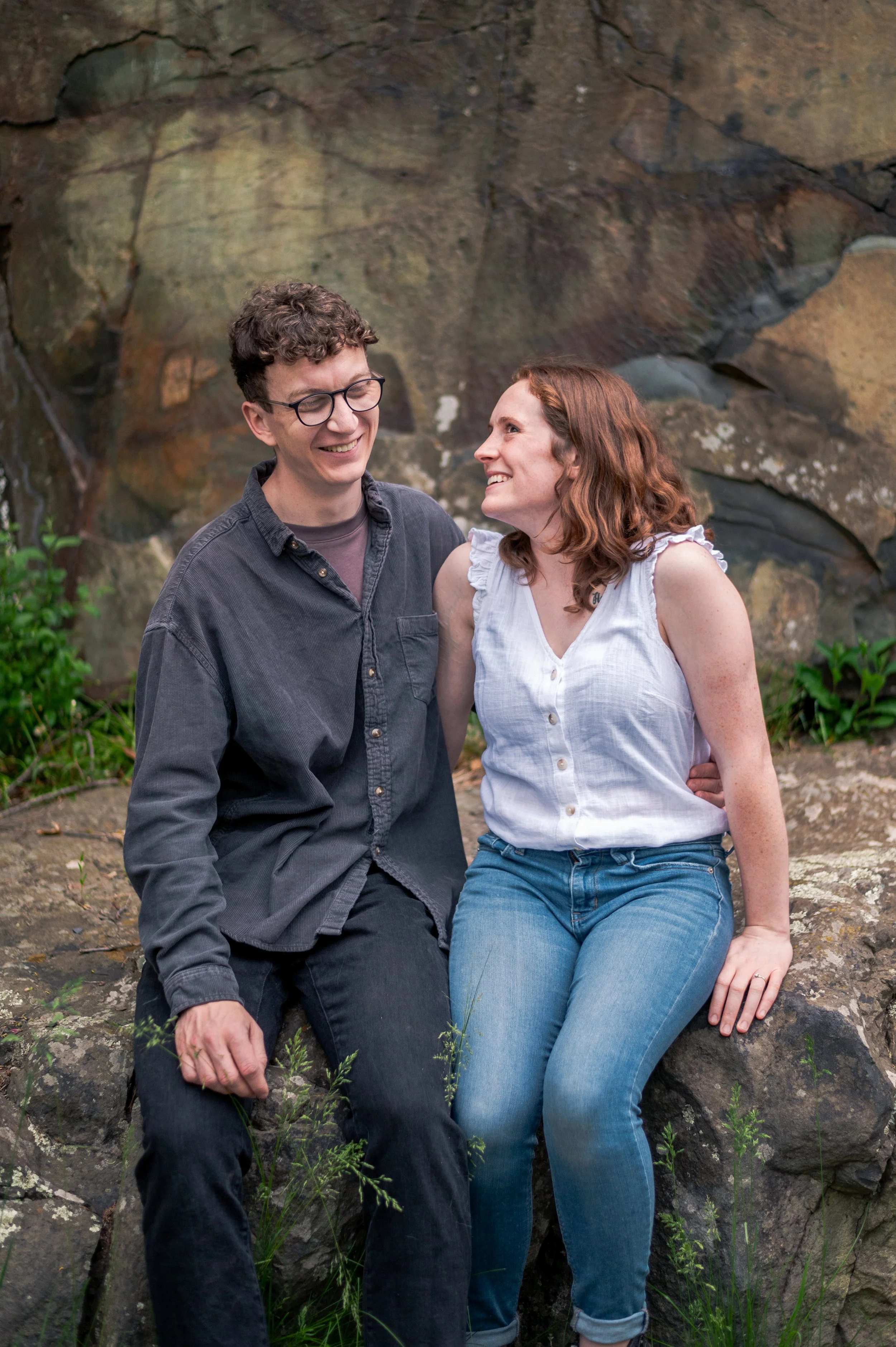 Skyler and Josh chose Interstate State Park for their engagement session. It was mid-July and there had just been a ton of rain, so we were unfortunately battling monstrously huge mosquitoes the entire time we hiked the bluffs (I can confidently say I’ve never seen mosquitoes this big, they may as well have been flies!) but these two were troopers throughout the whole ordeal. Josh, having just moved here from the UK, began developing small welts from the bites so we hustled over to the visitor center. Thankfully they relented once we arrived at the glacial potholes. We explored the nooks and crannies around us, finding pockets of quiet spaces all to ourselves despite the lot being quite full.