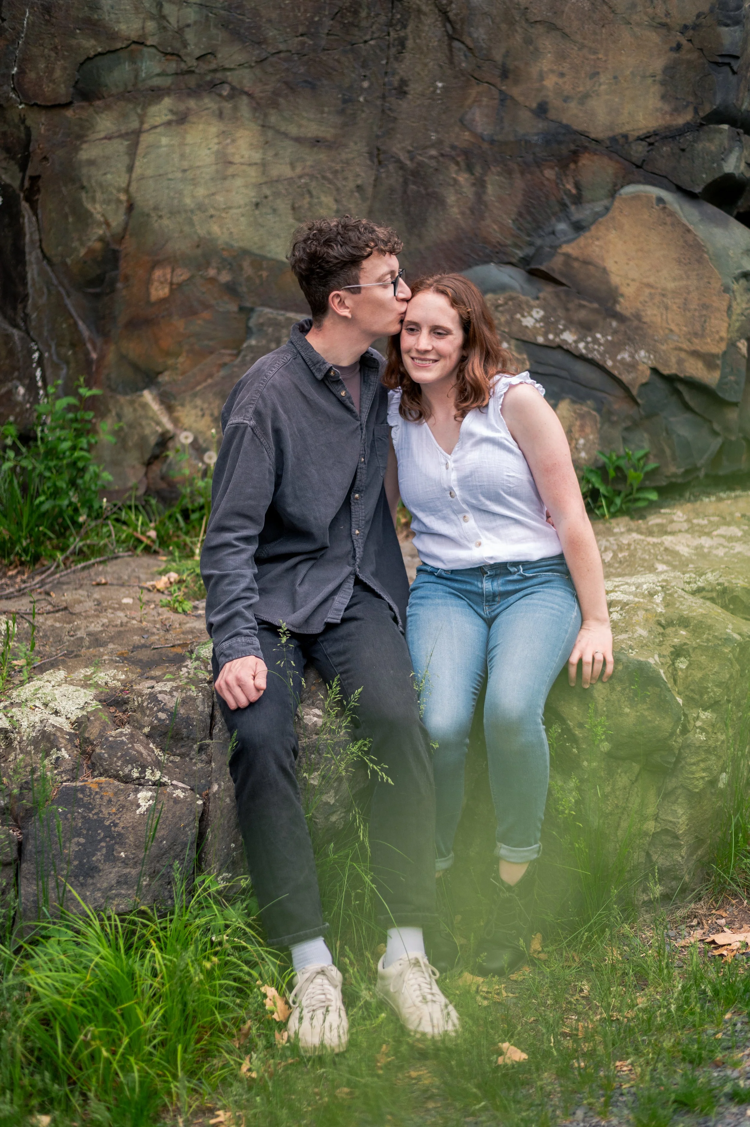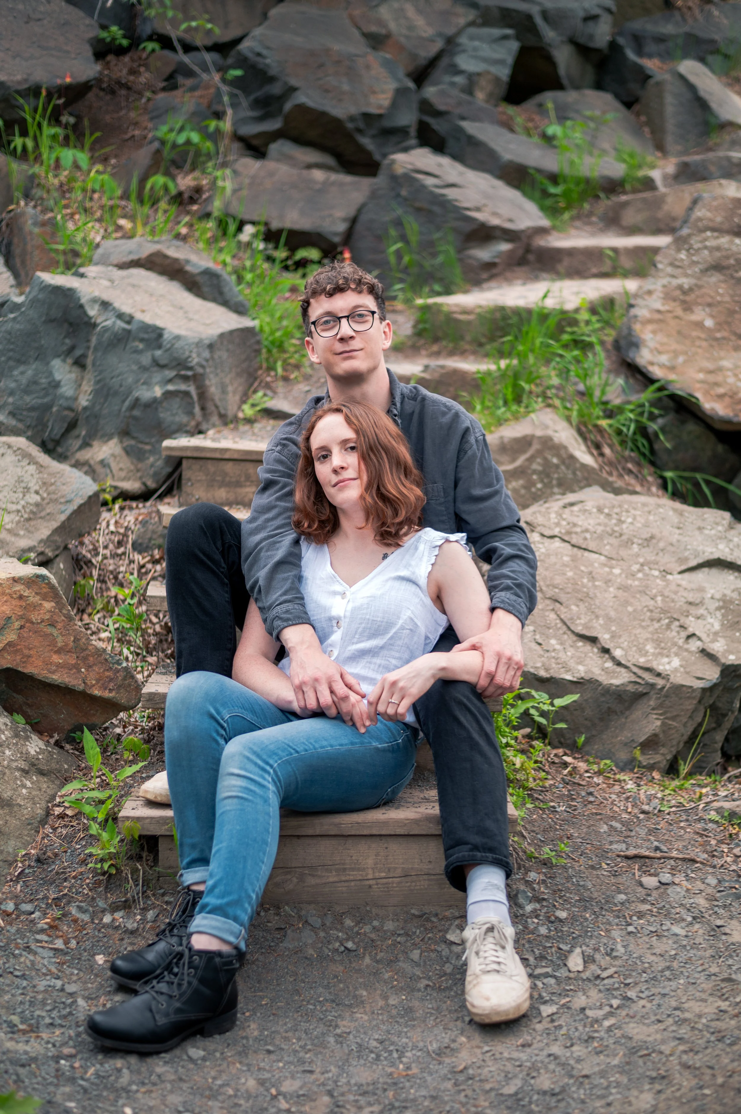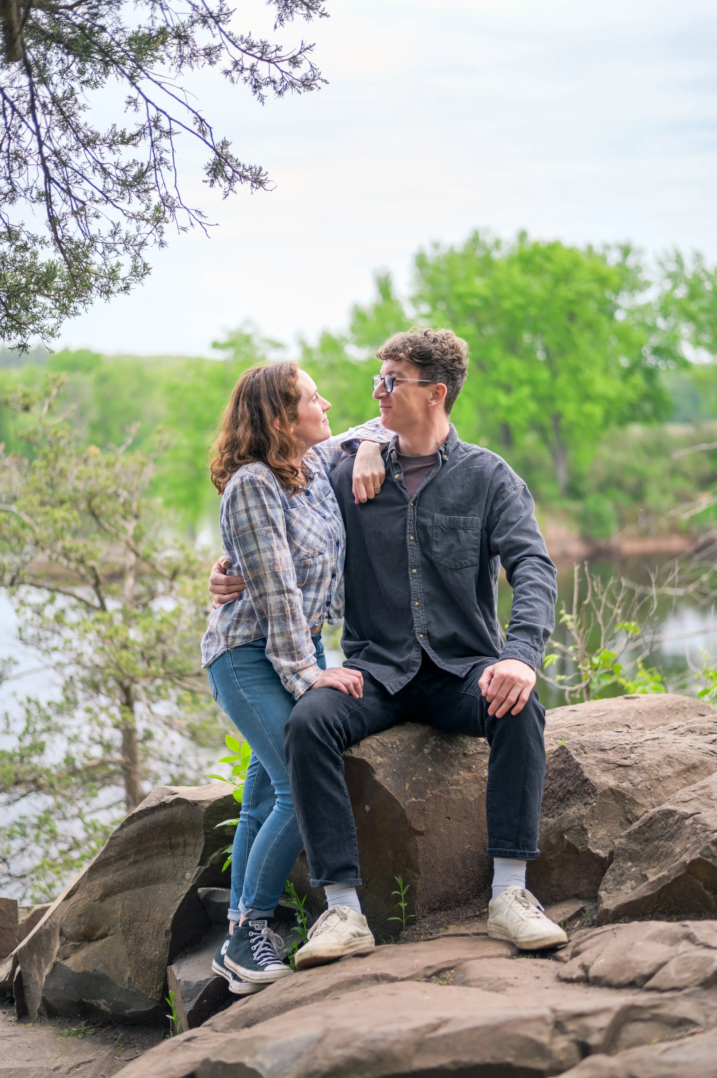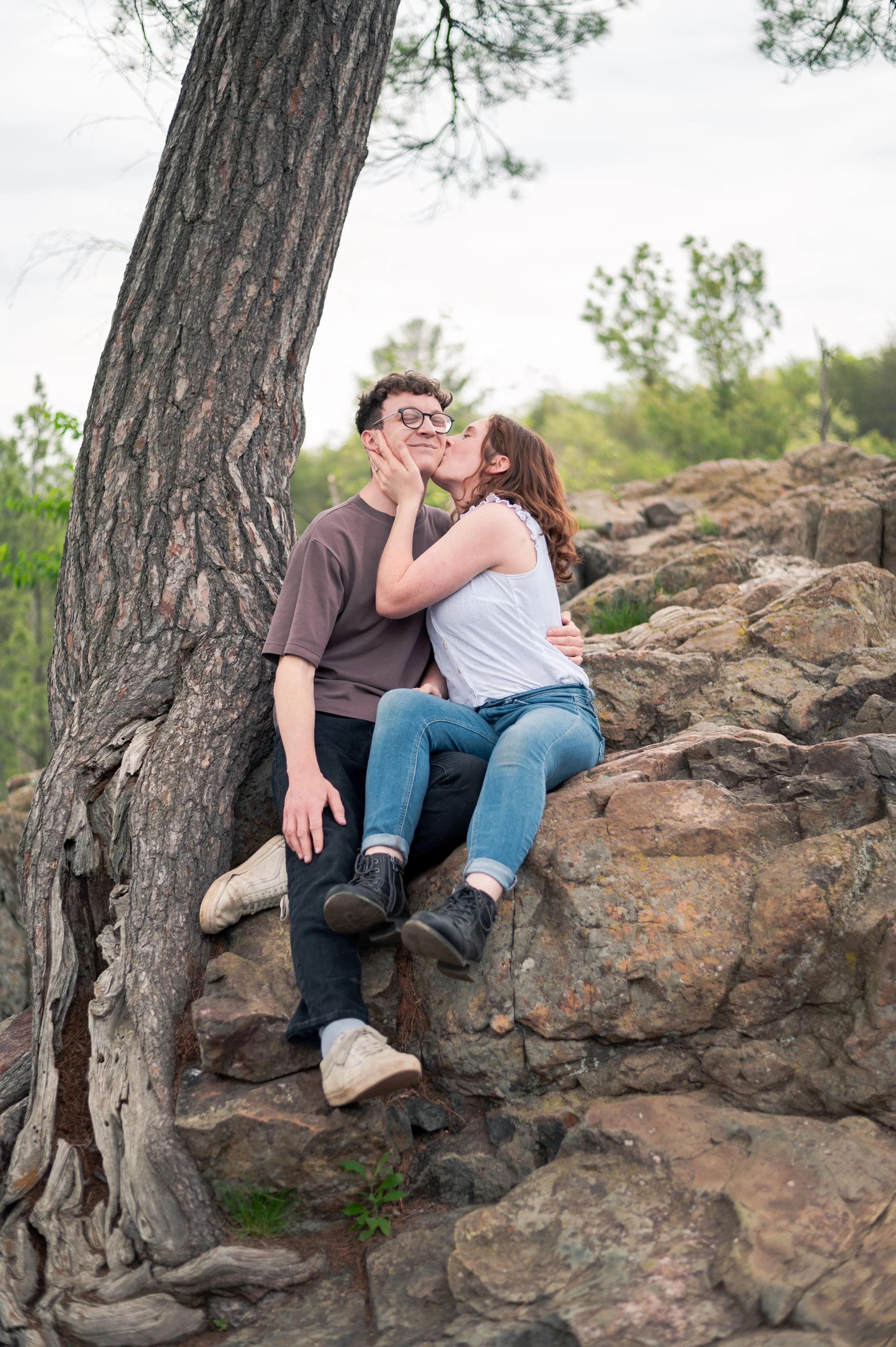 Skyler and Josh chose Interstate State Park for their engagement session. It was mid-July and there had just been a ton of rain, so we were unfortunately battling monstrously huge mosquitoes the entire time we hiked the bluffs (I can confidently say I’ve never seen mosquitoes this big, they may as well have been flies!) but these two were troopers throughout the whole ordeal. Josh, having just moved here from the UK, began developing small welts from the bites so we hustled over to the visitor center. Thankfully they relented once we arrived at the glacial potholes. We explored the nooks and crannies around us, finding pockets of quiet spaces all to ourselves despite the lot being quite full.