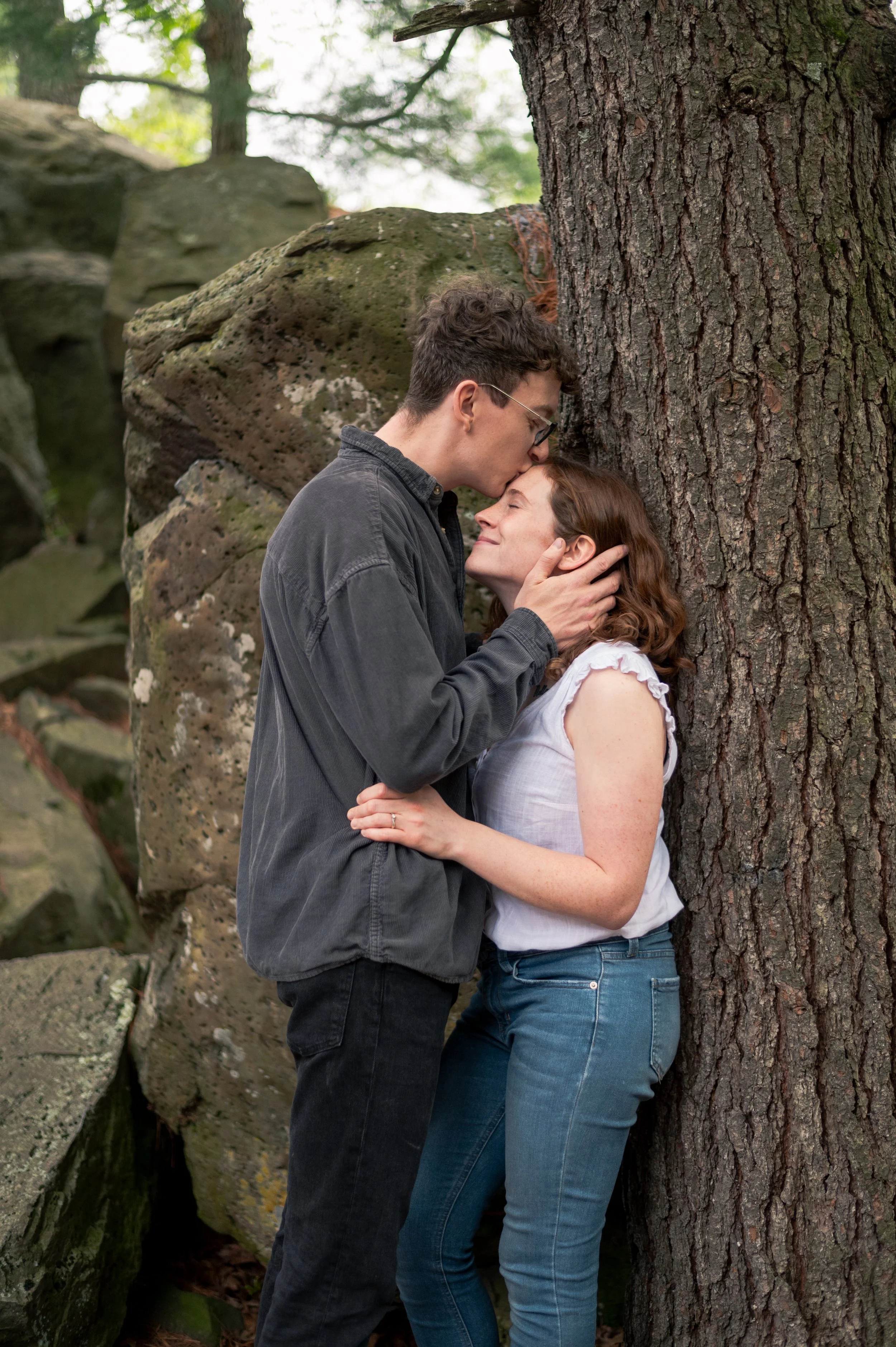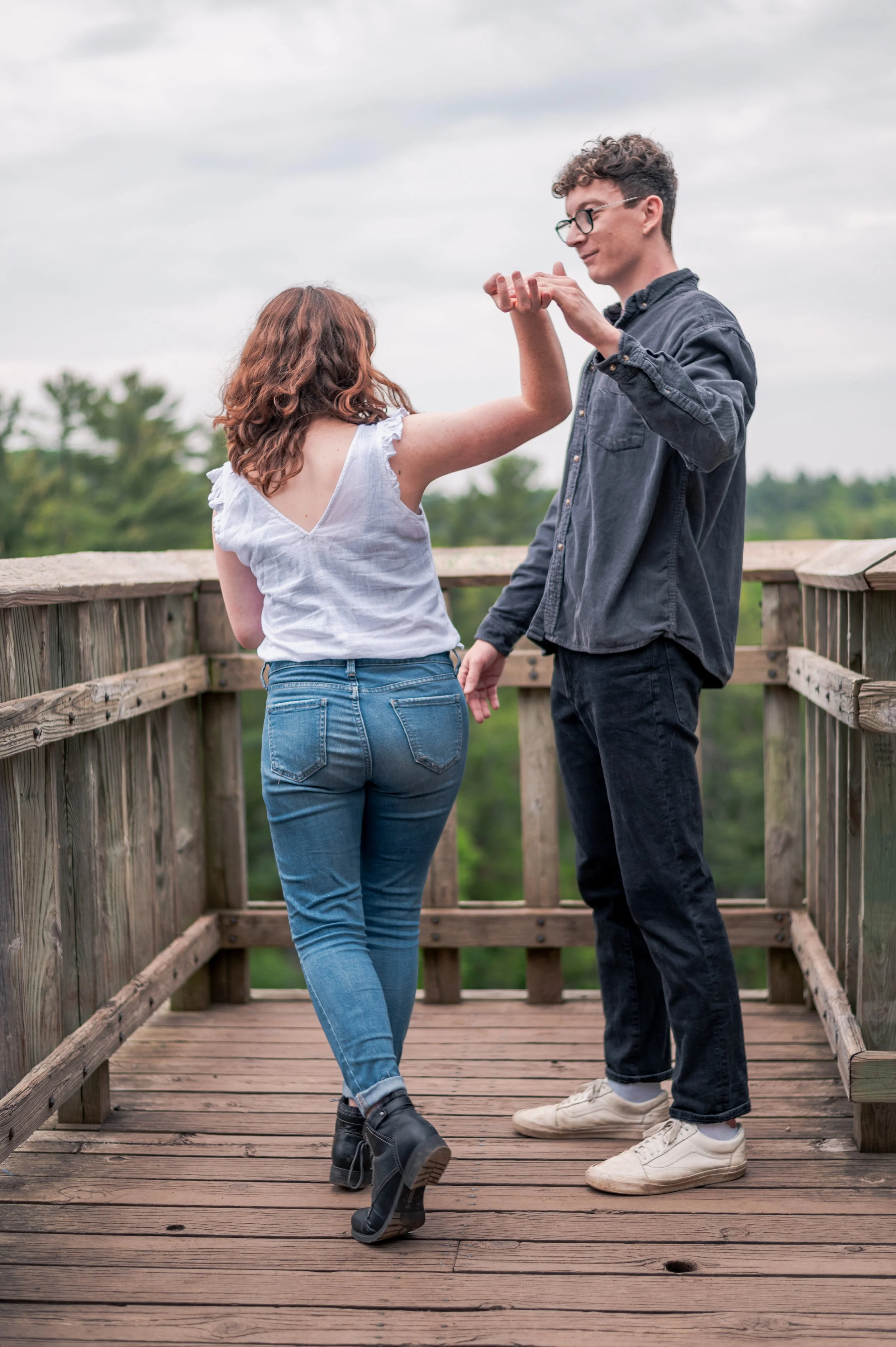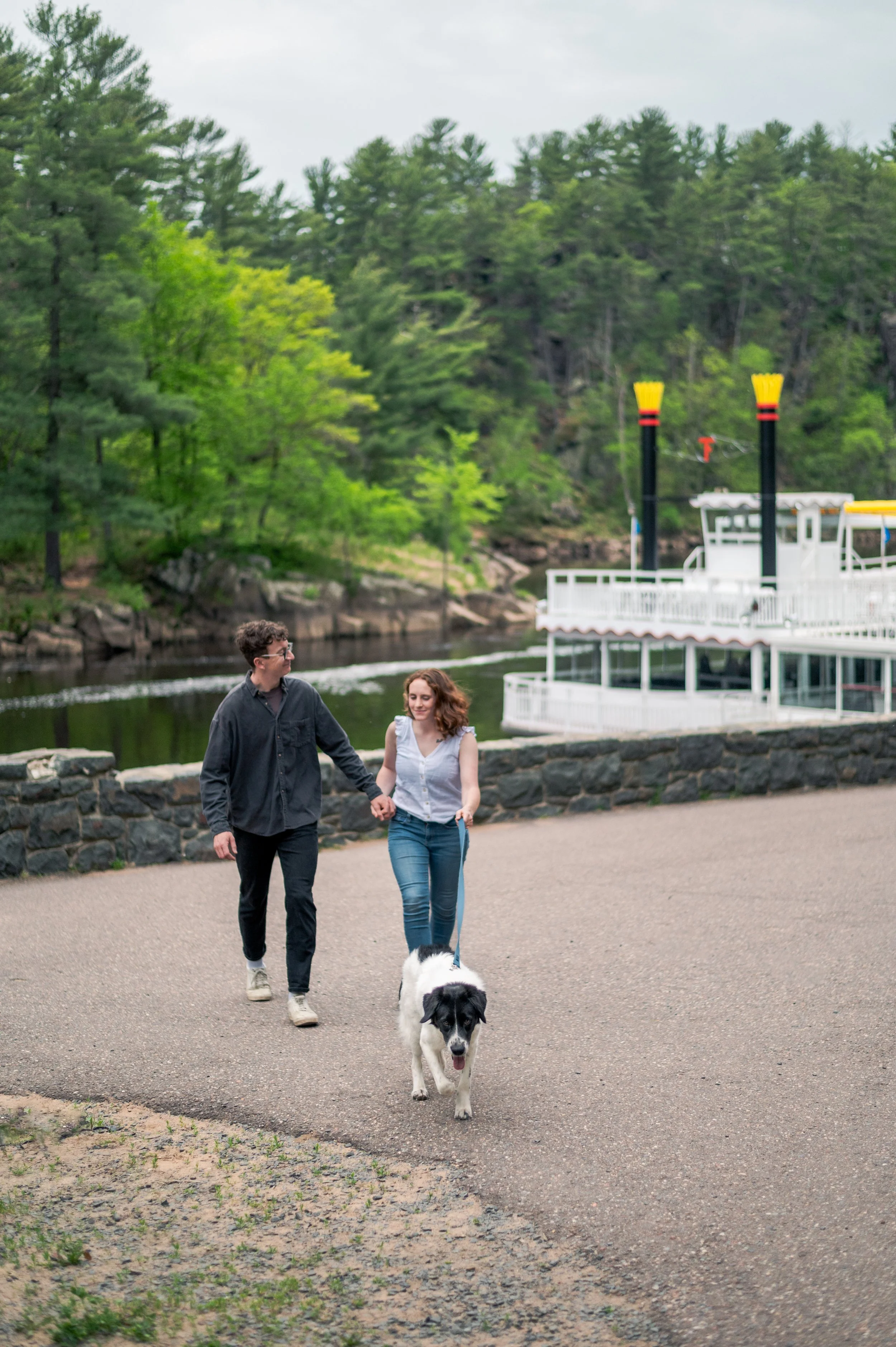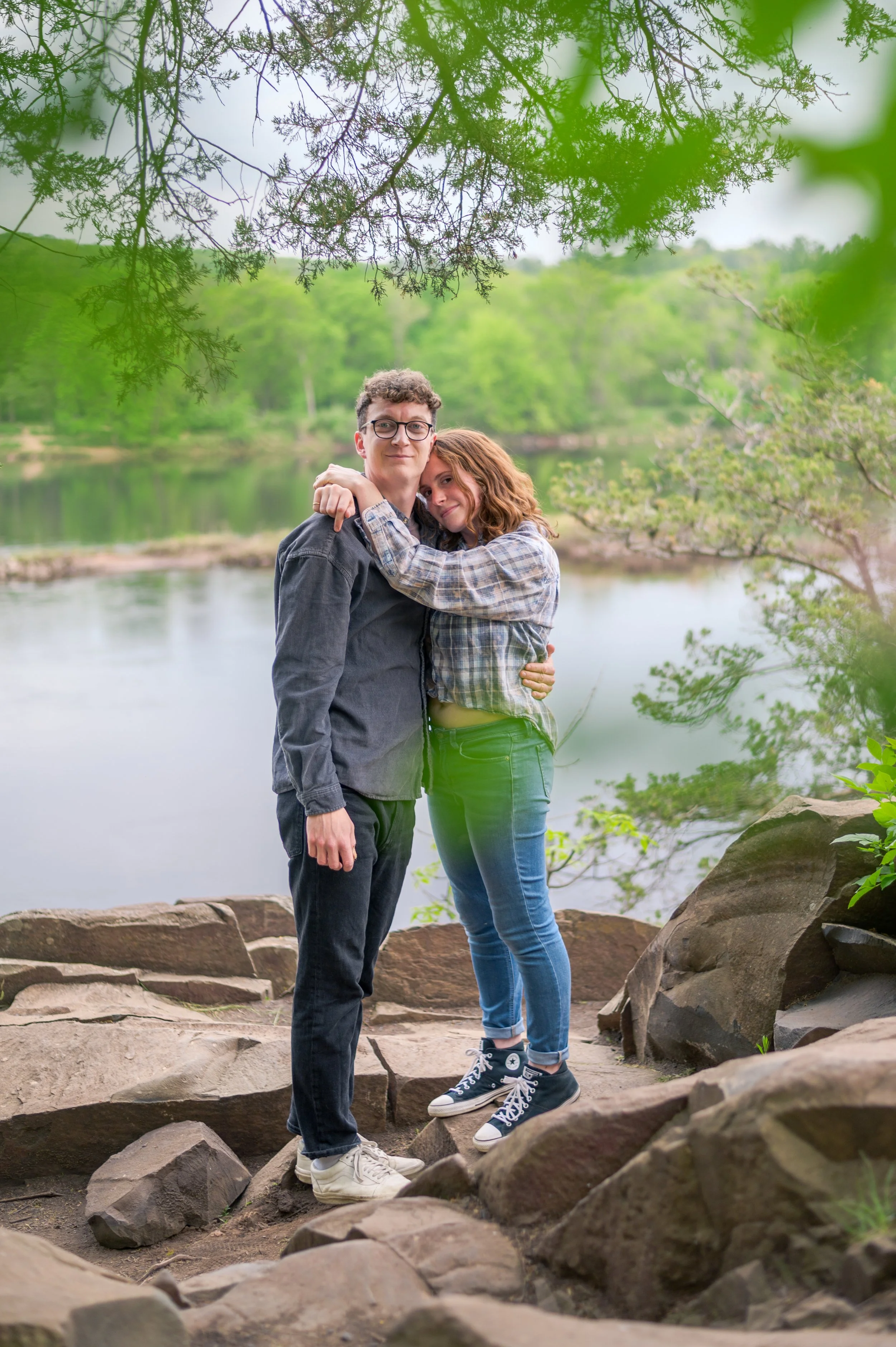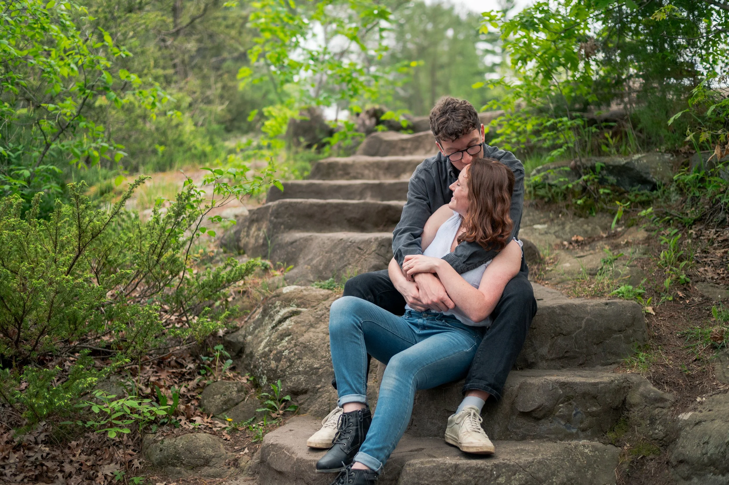 Skyler and Josh chose Interstate State Park for their engagement session. It was mid-July and there had just been a ton of rain, so we were unfortunately battling monstrously huge mosquitoes the entire time we hiked the bluffs (I can confidently say I’ve never seen mosquitoes this big, they may as well have been flies!) but these two were troopers throughout the whole ordeal. Josh, having just moved here from the UK, began developing small welts from the bites so we hustled over to the visitor center. Thankfully they relented once we arrived at the glacial potholes. We explored the nooks and crannies around us, finding pockets of quiet spaces all to ourselves despite the lot being quite full.