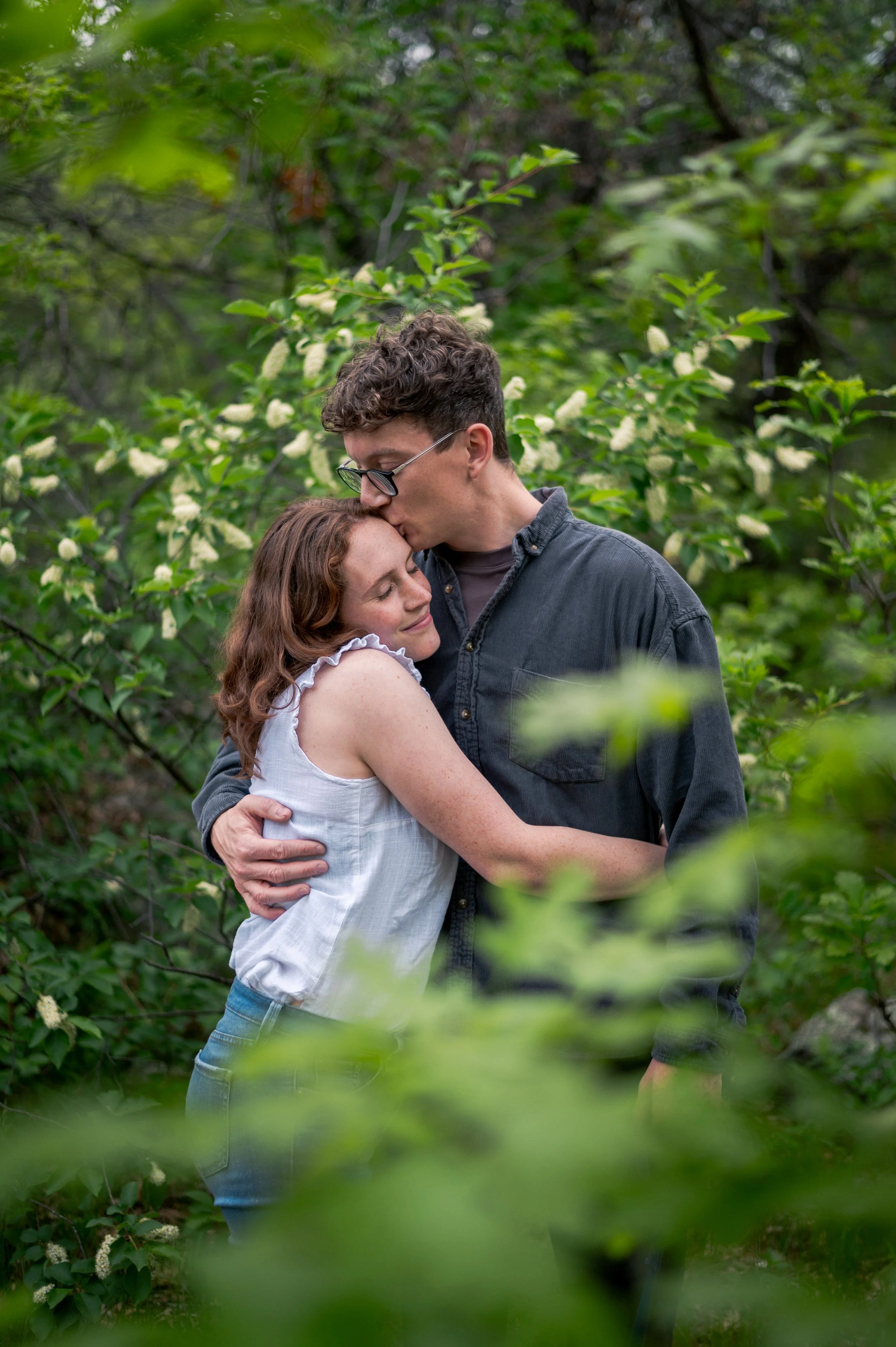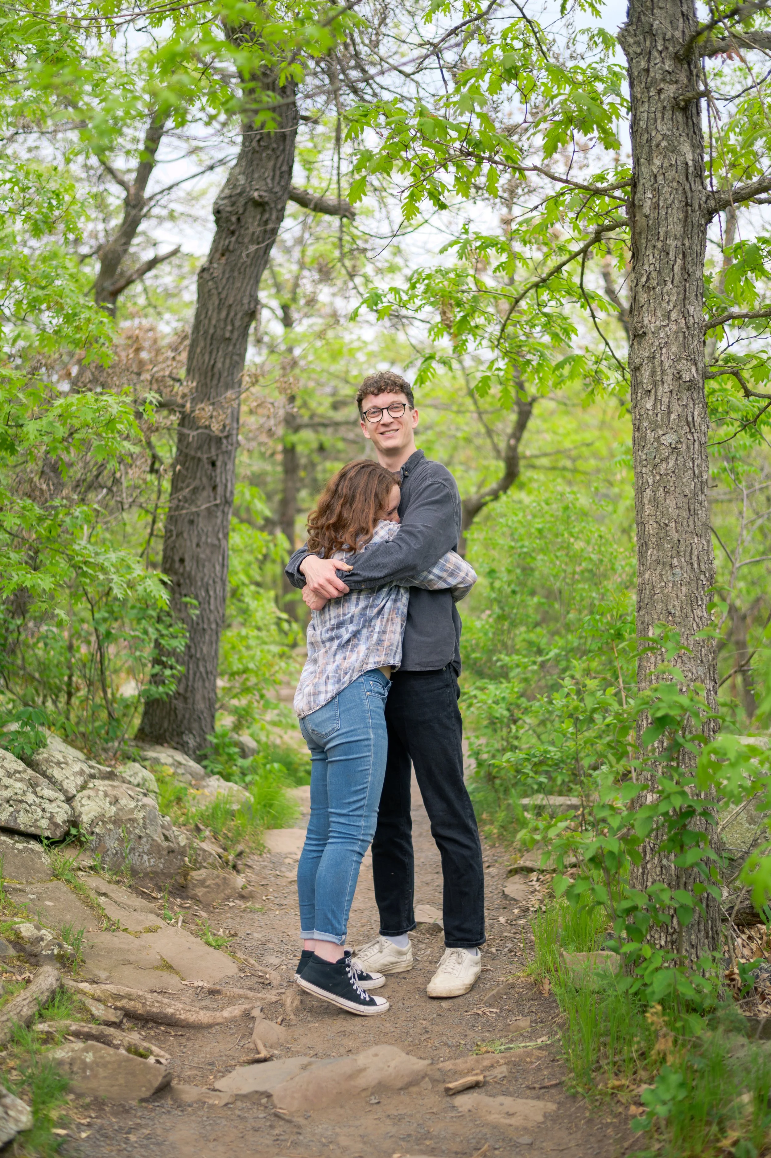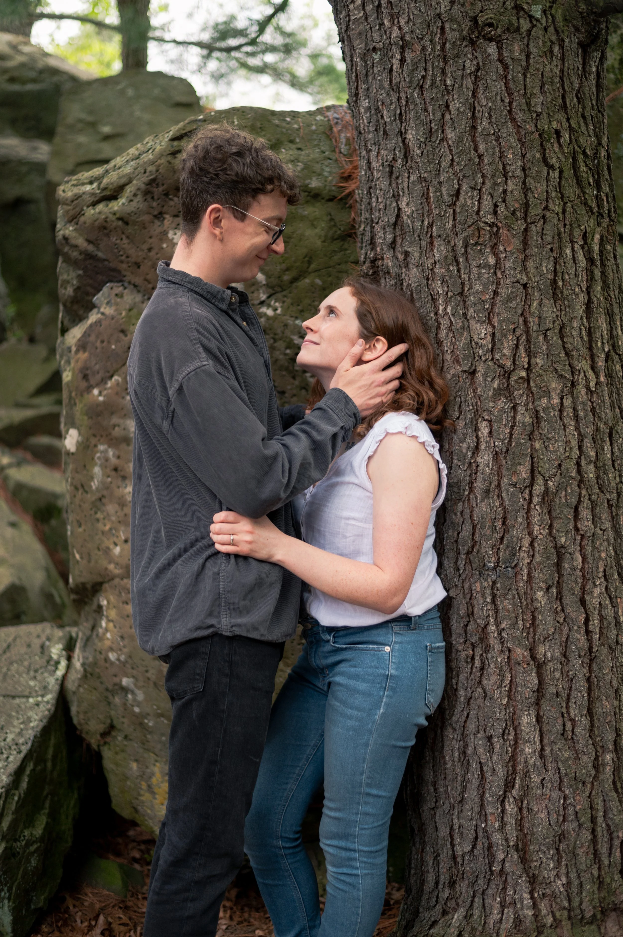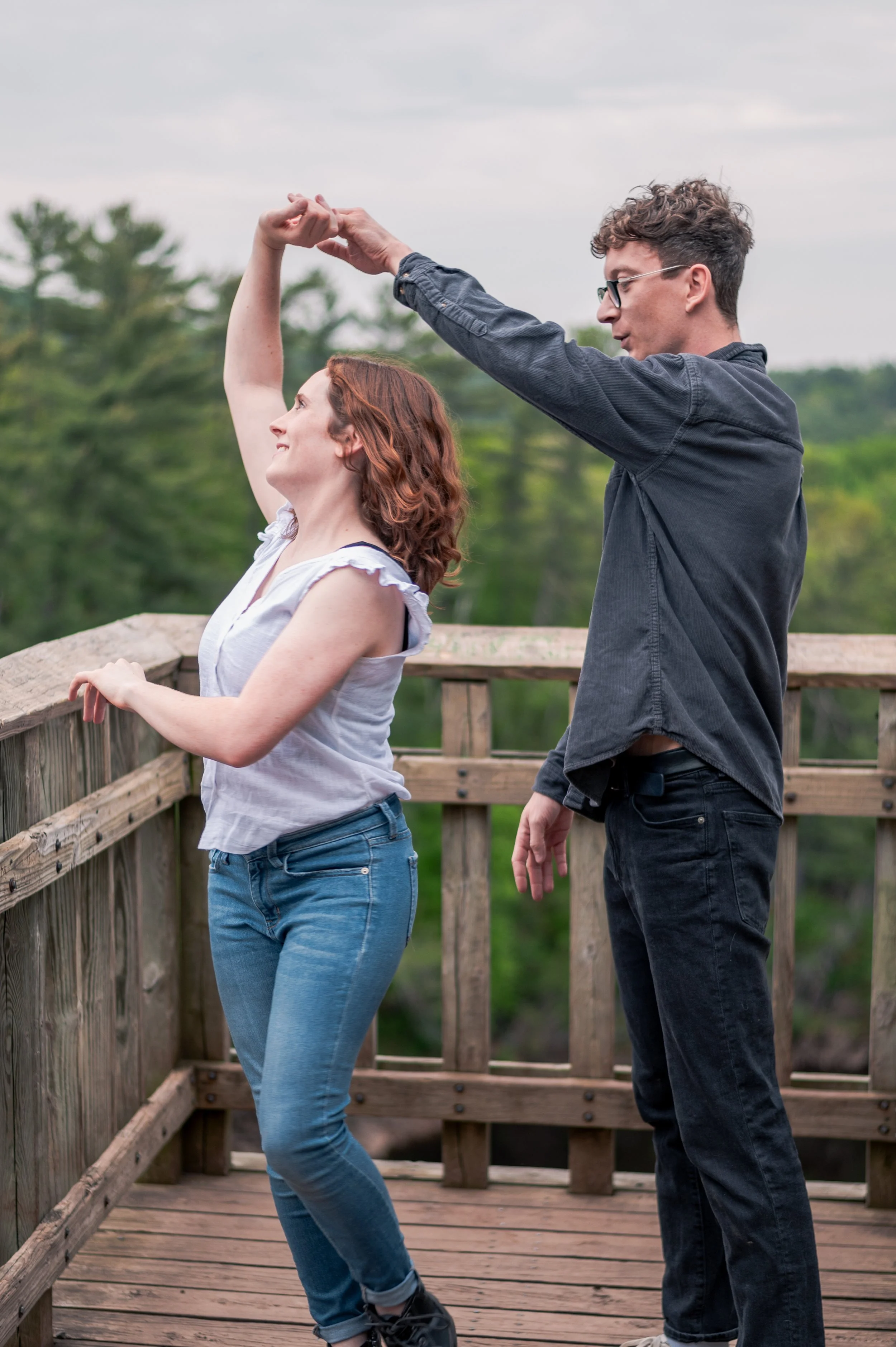 Skyler and Josh chose Interstate State Park for their engagement session. It was mid-July and there had just been a ton of rain, so we were unfortunately battling monstrously huge mosquitoes the entire time we hiked the bluffs (I can confidently say I’ve never seen mosquitoes this big, they may as well have been flies!) but these two were troopers throughout the whole ordeal. Josh, having just moved here from the UK, began developing small welts from the bites so we hustled over to the visitor center. Thankfully they relented once we arrived at the glacial potholes. We explored the nooks and crannies around us, finding pockets of quiet spaces all to ourselves despite the lot being quite full.