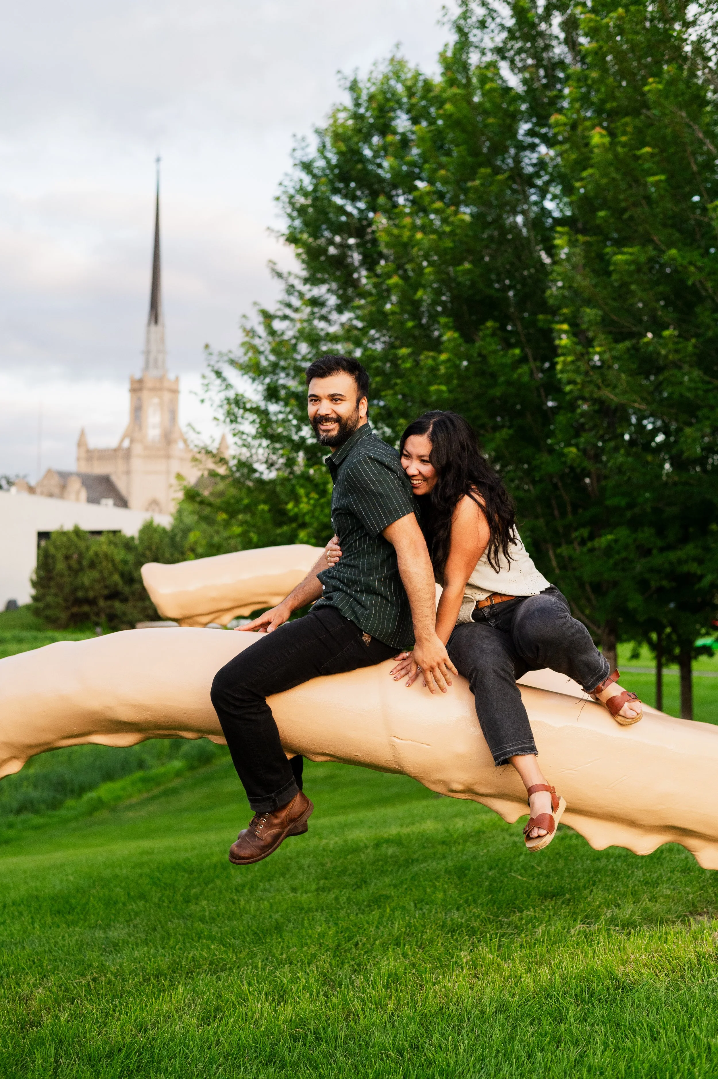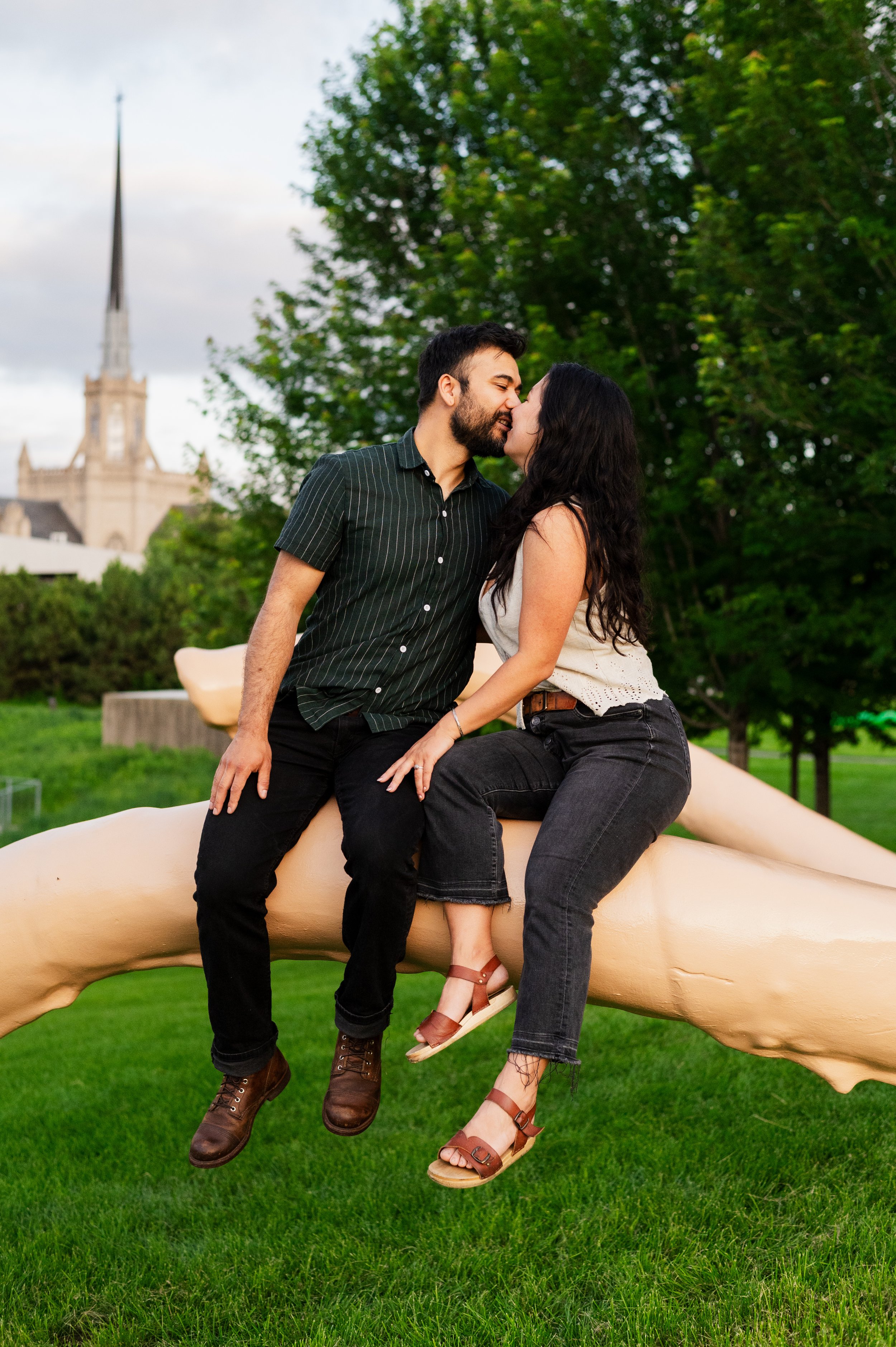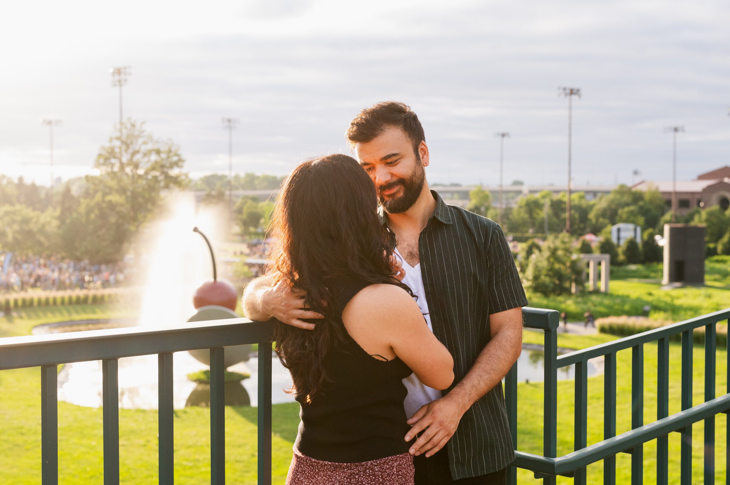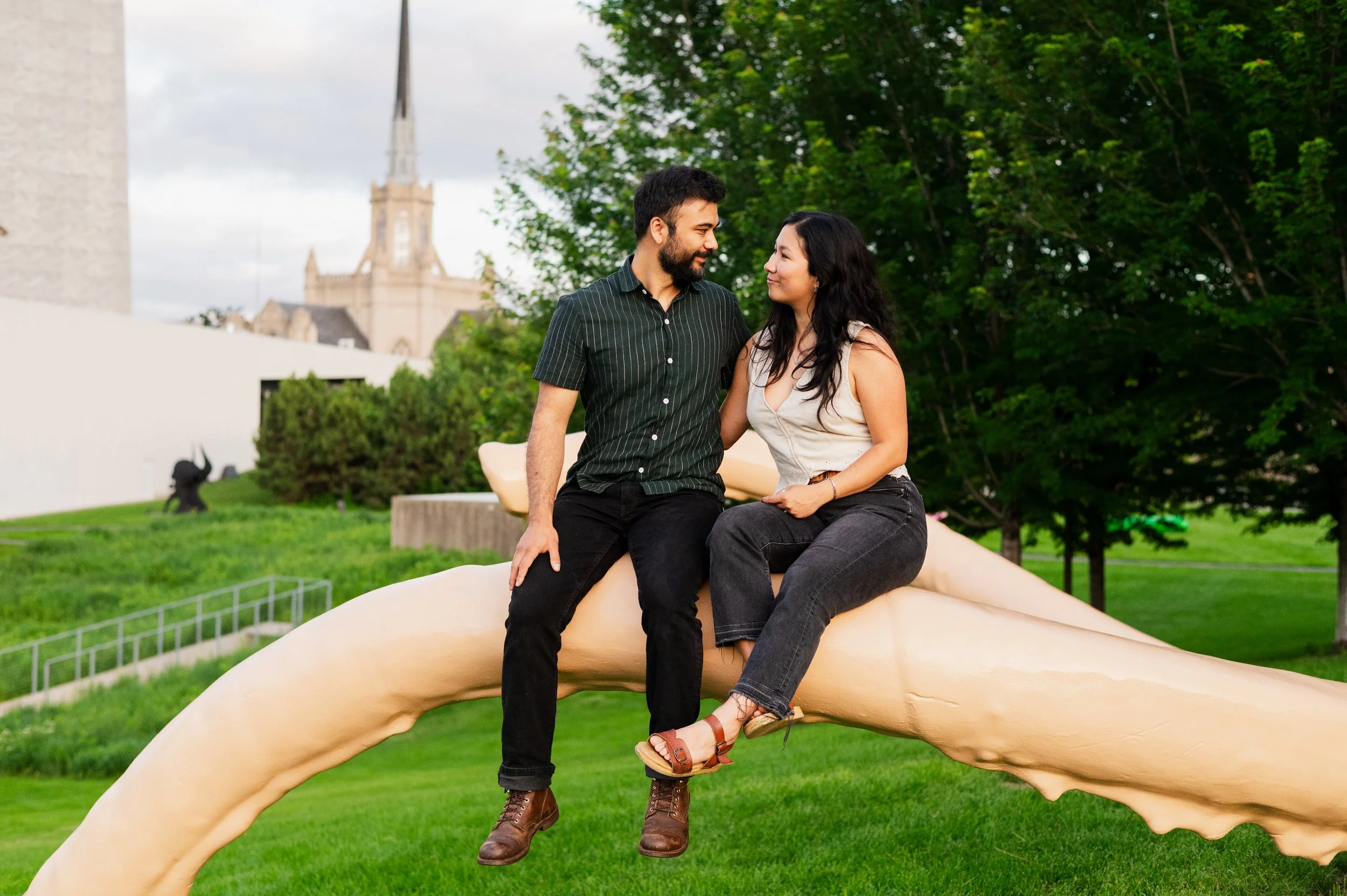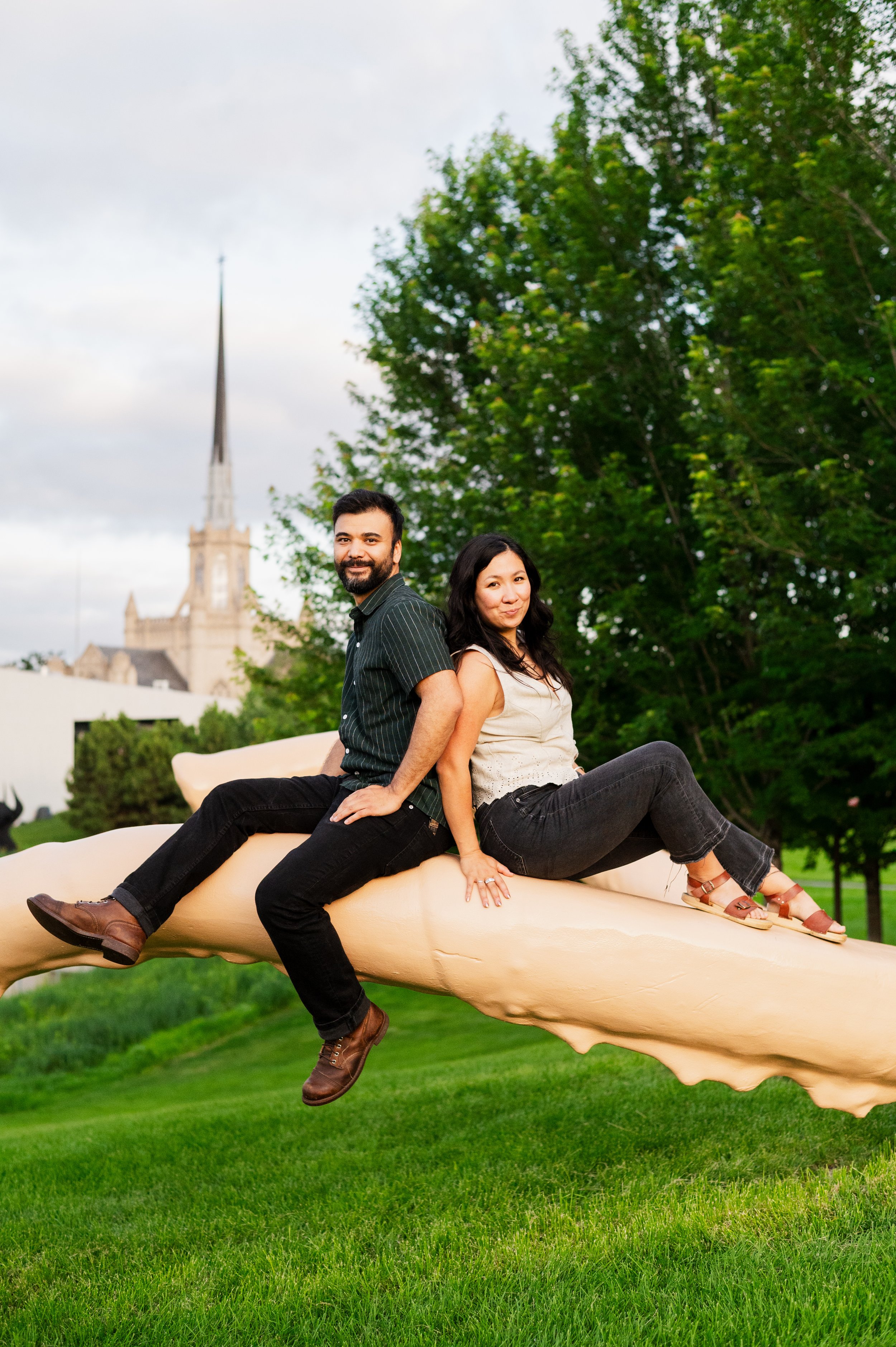 When I was planning Sonia and Peter’s engagement session with them, the initial plan was to do some fly fishing at a creek they frequent. We were so excited for this, however, the summer weather in Minnesota is fickle. After some inclement weather delays, we decided to turn our sights to the Minneapolis Sculpture Garden at the Walker Art Center. Still, rain thwarted us time and time again, delaying us to the point we doubted we were going to get a sunny session, but luck was with us! It just so happened to be the same day as Pride too! The gardens were full of people smiling, music filling the air. The sky threatened us with moody clouds, but the rain held off for the entire session. The lighting was phenomenal and I had so much fun taking these; this location just lends so much to the creative juices. Sonia and Peter also did wonderfully in front of the camera.