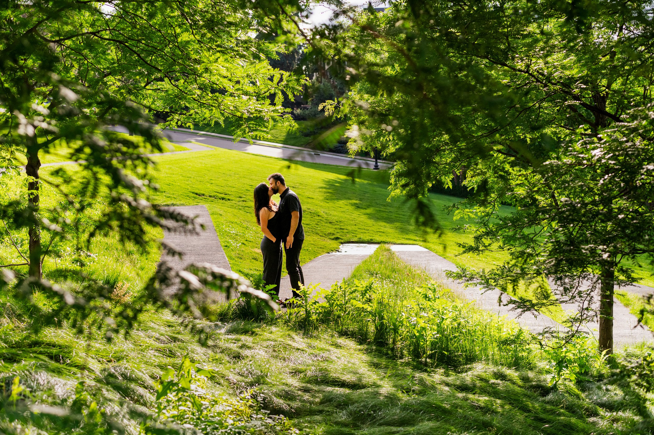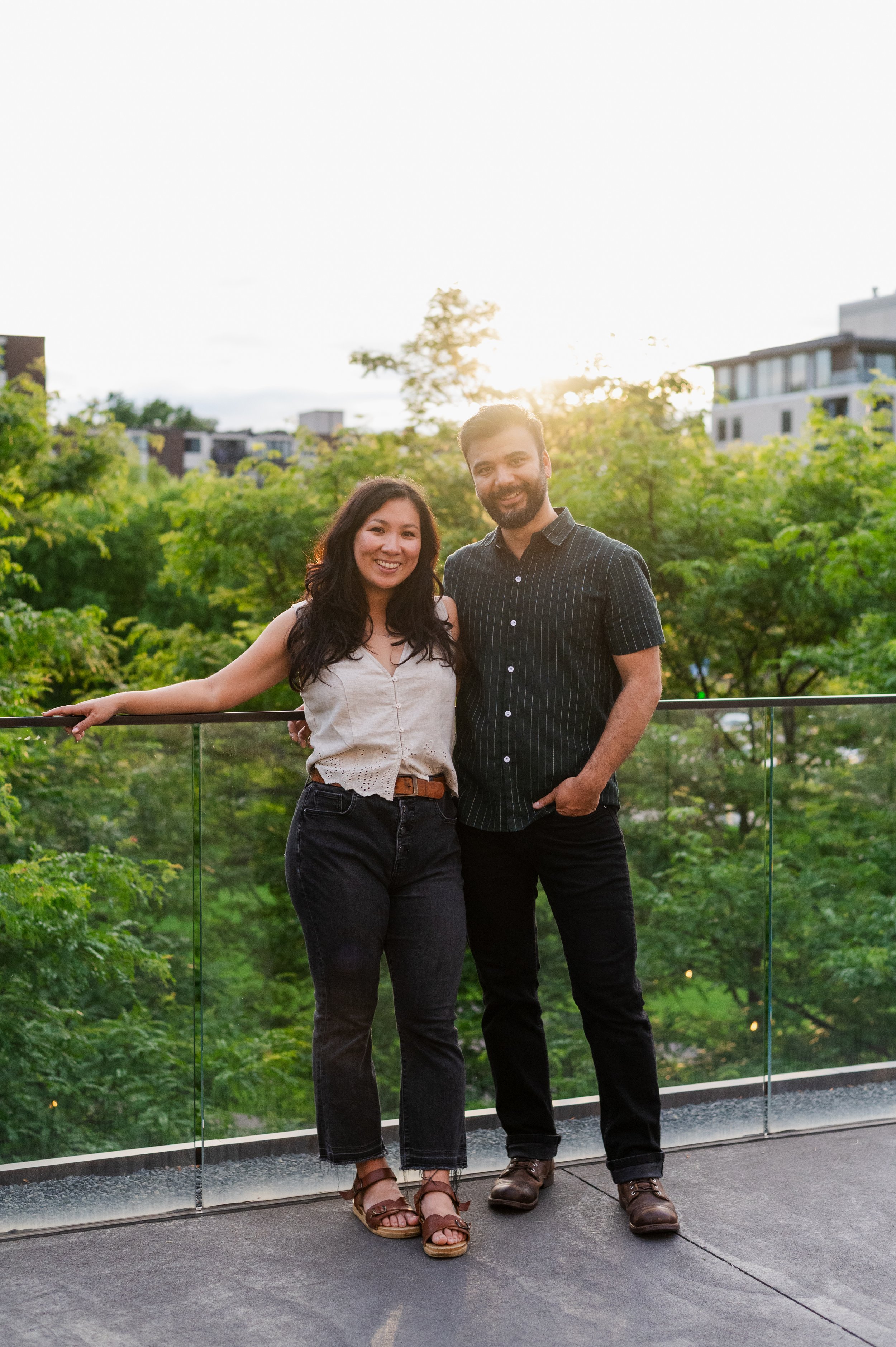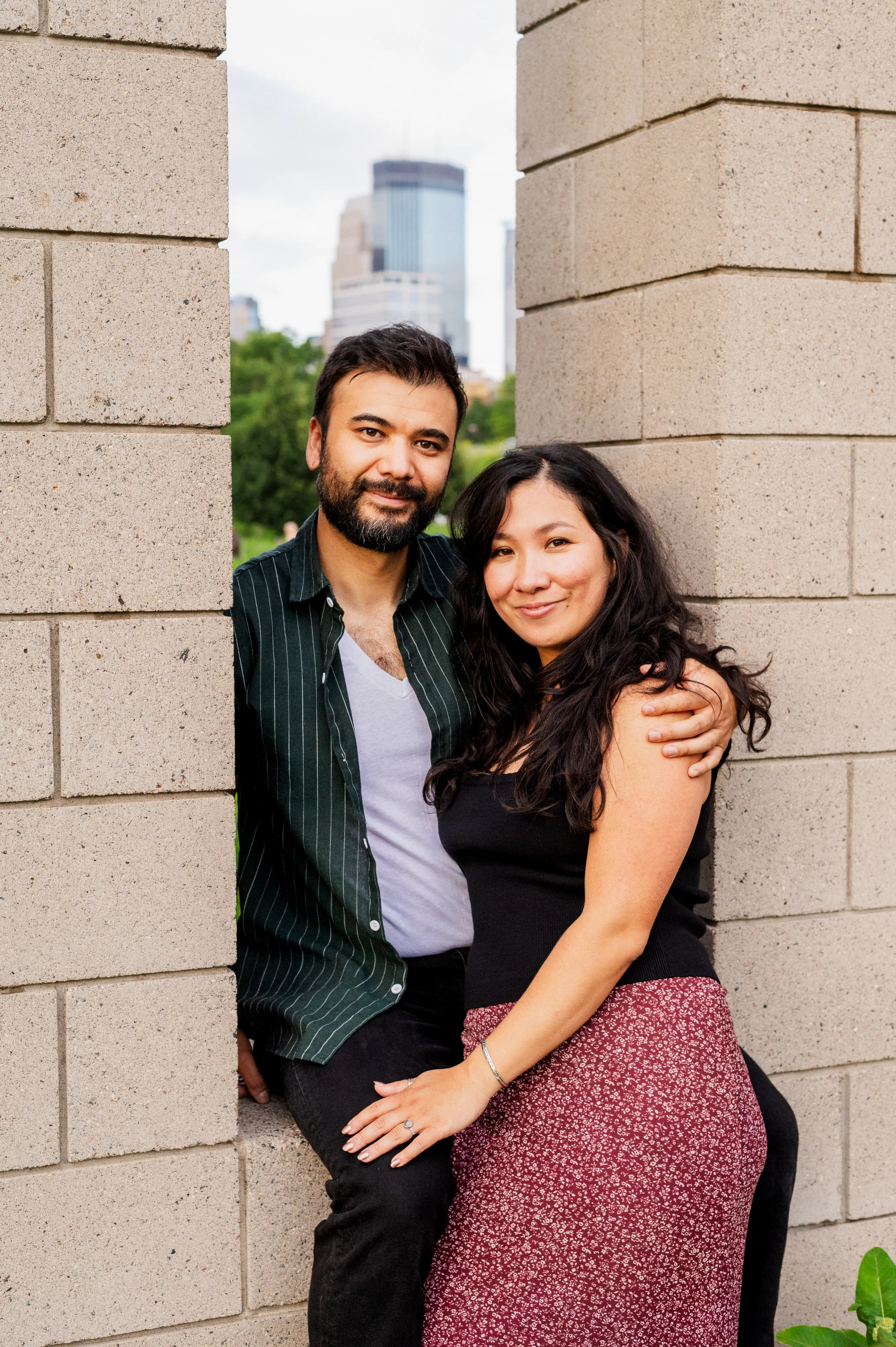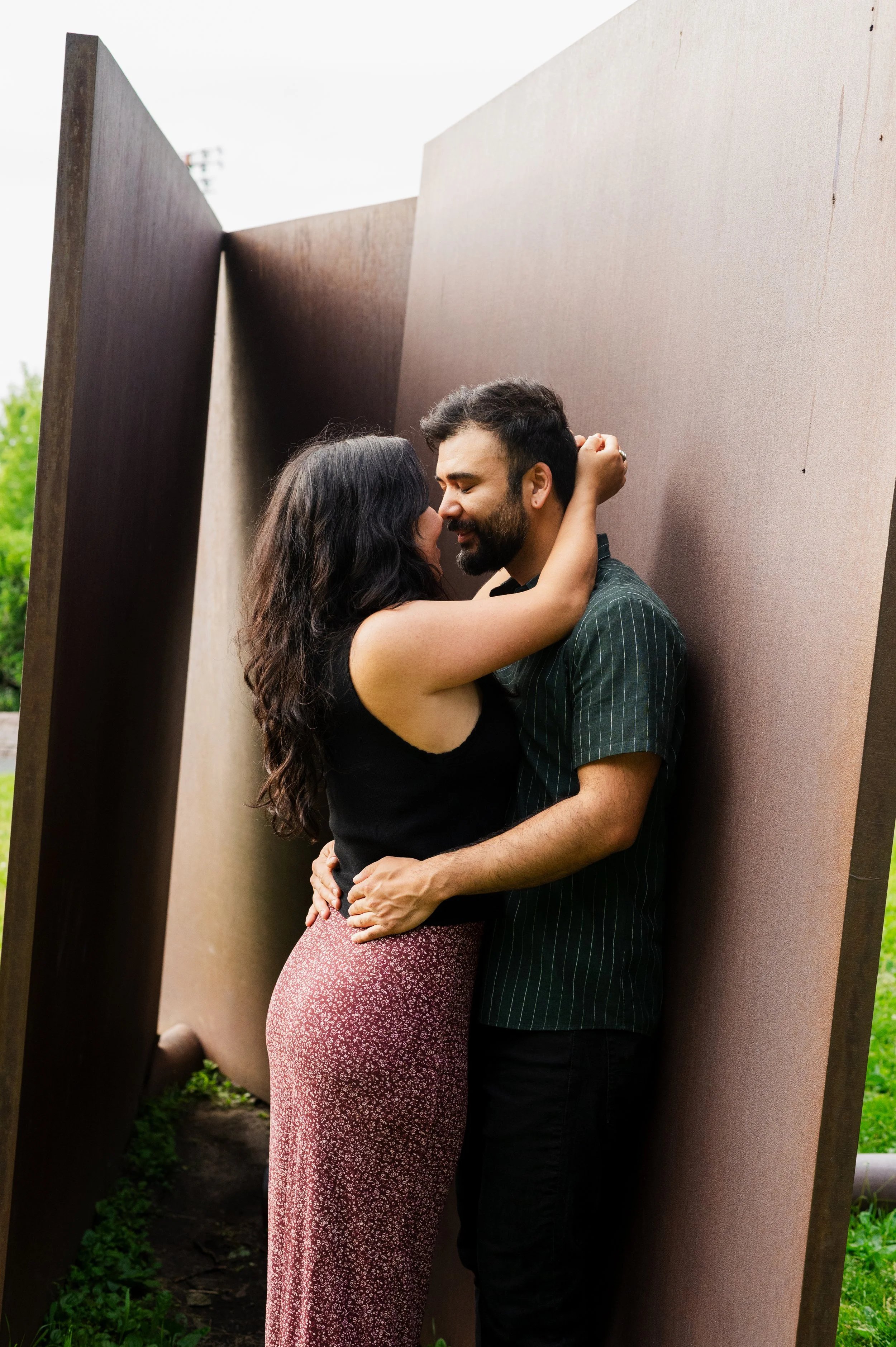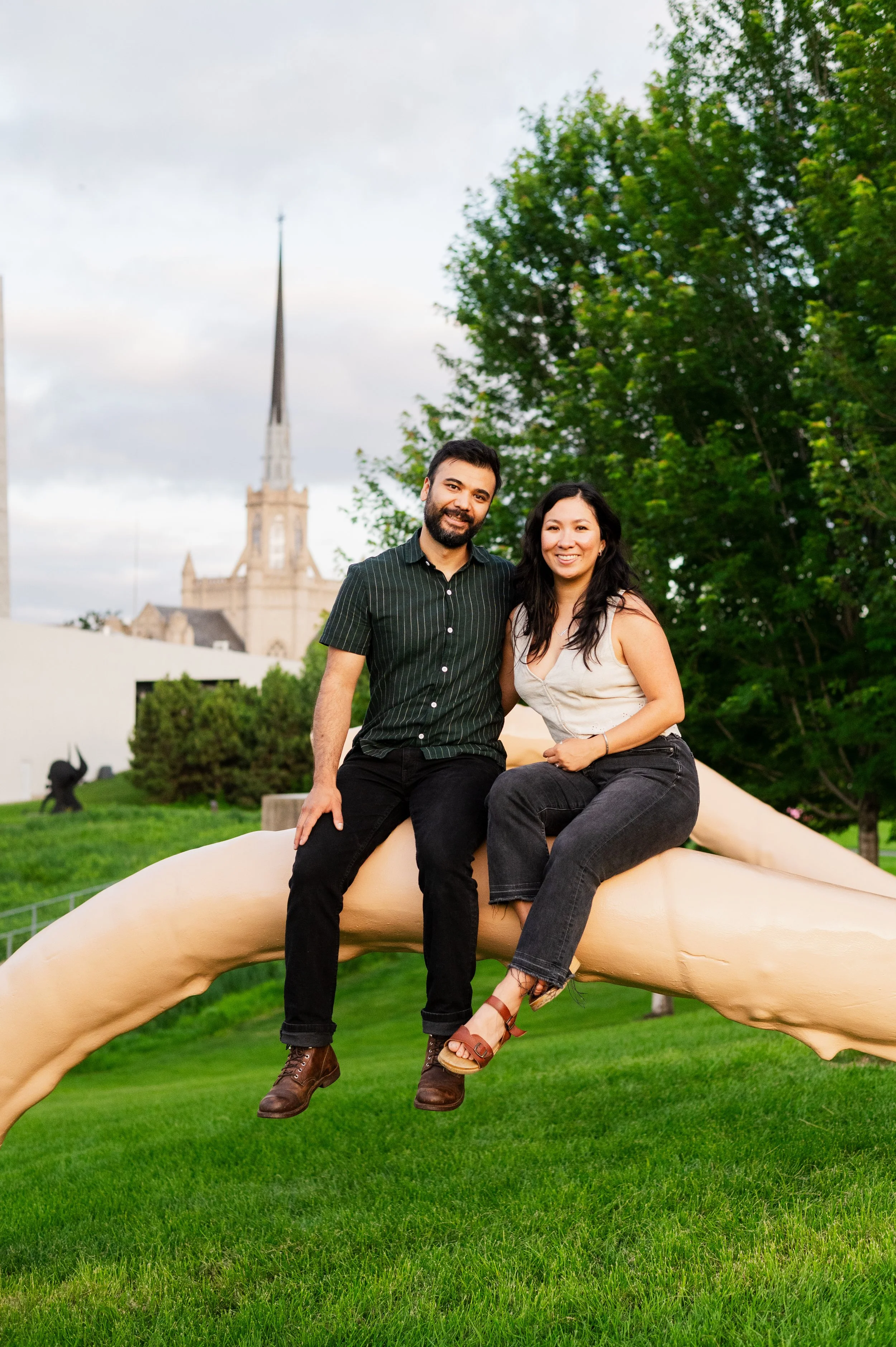 When I was planning Sonia and Peter’s engagement session with them, the initial plan was to do some fly fishing at a creek they frequent. We were so excited for this, however, the summer weather in Minnesota is fickle. After some inclement weather delays, we decided to turn our sights to the Minneapolis Sculpture Garden at the Walker Art Center. Still, rain thwarted us time and time again, delaying us to the point we doubted we were going to get a sunny session, but luck was with us! It just so happened to be the same day as Pride too! The gardens were full of people smiling, music filling the air. The sky threatened us with moody clouds, but the rain held off for the entire session. The lighting was phenomenal and I had so much fun taking these; this location just lends so much to the creative juices. Sonia and Peter also did wonderfully in front of the camera.