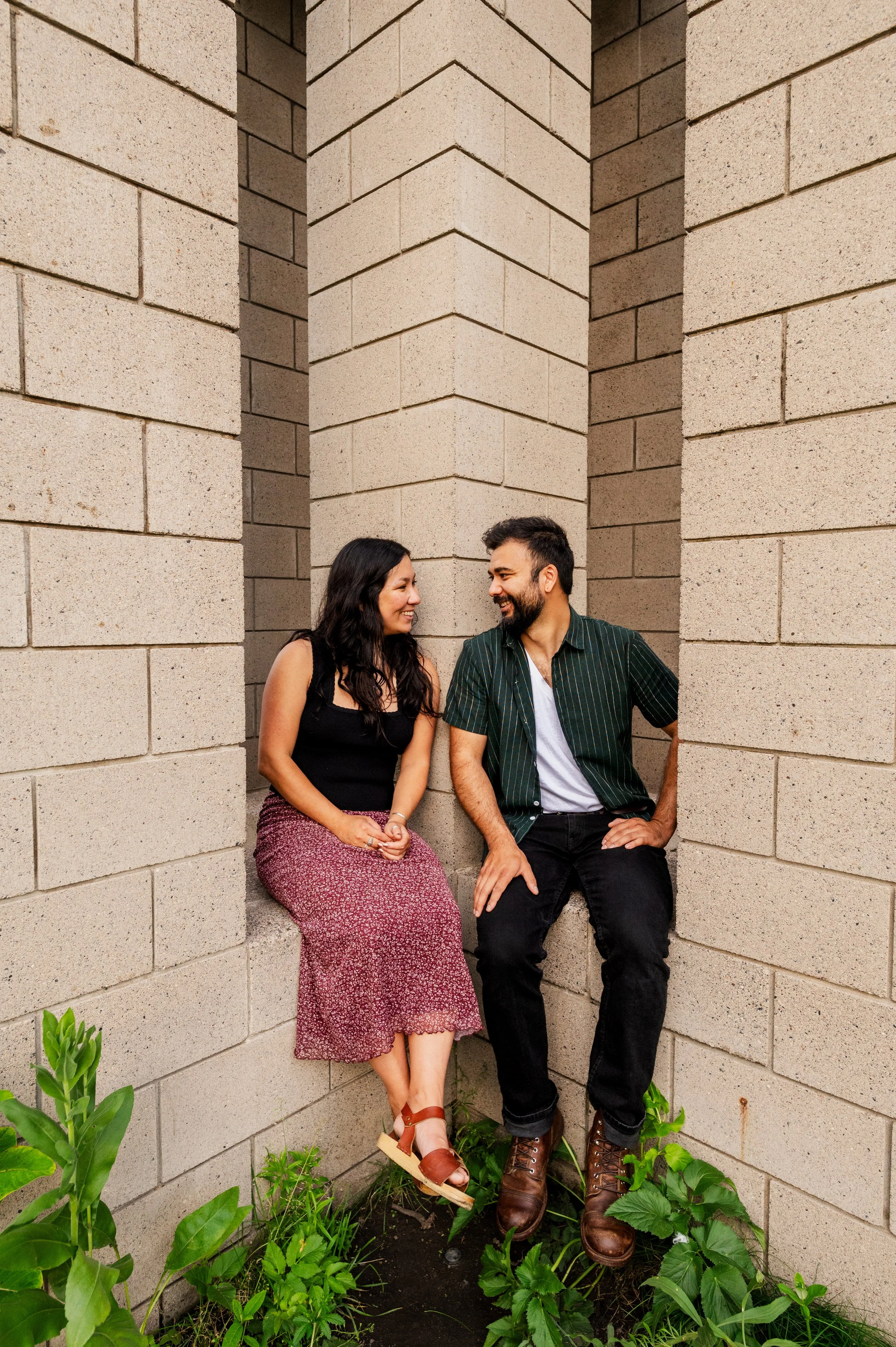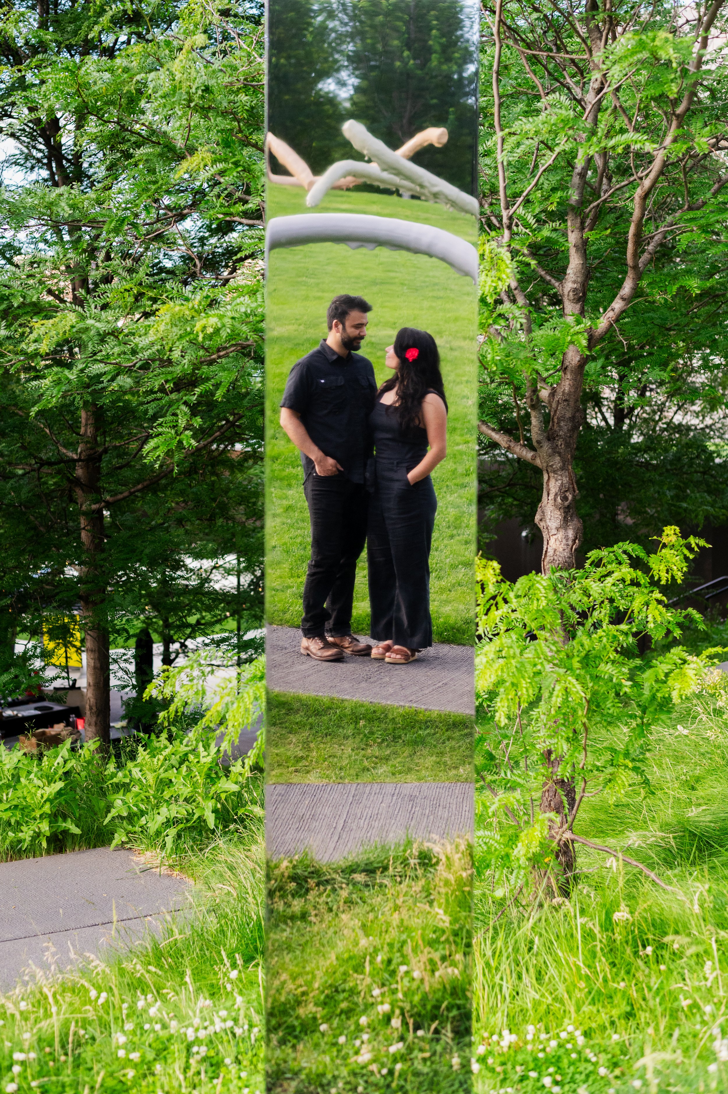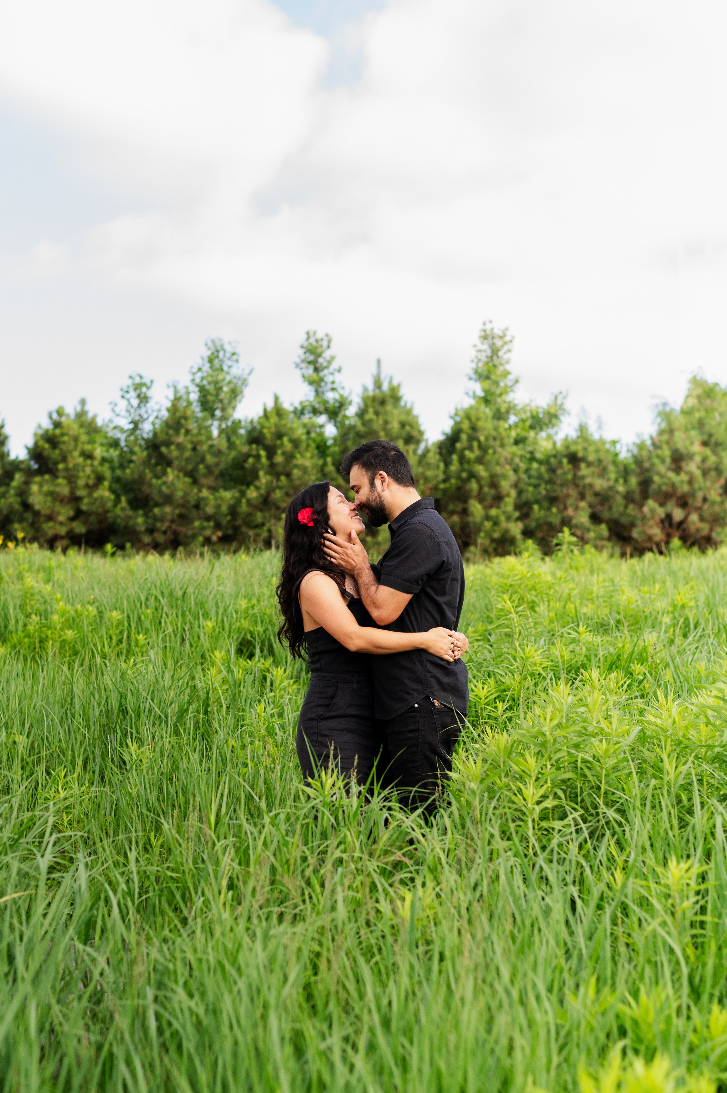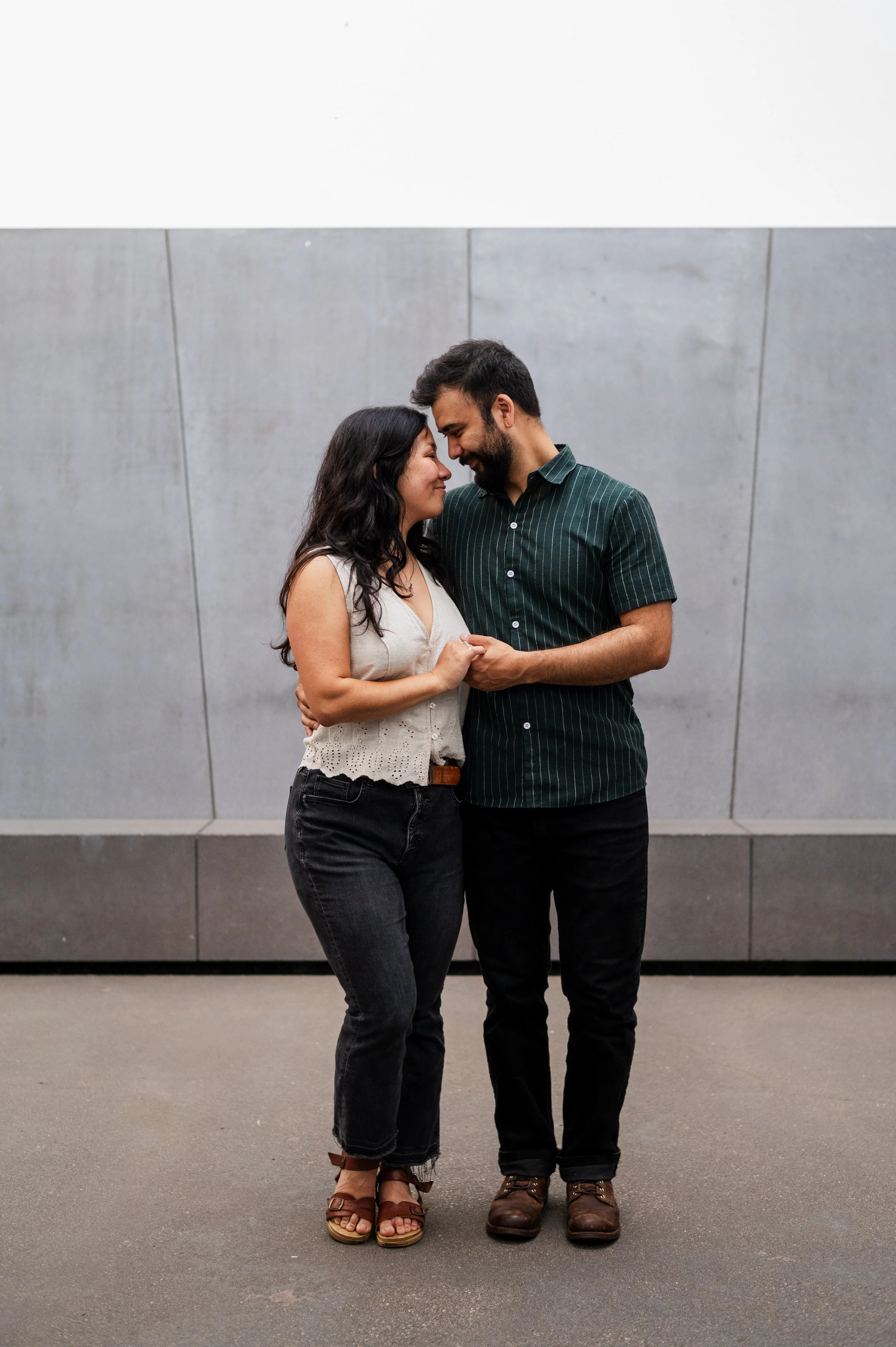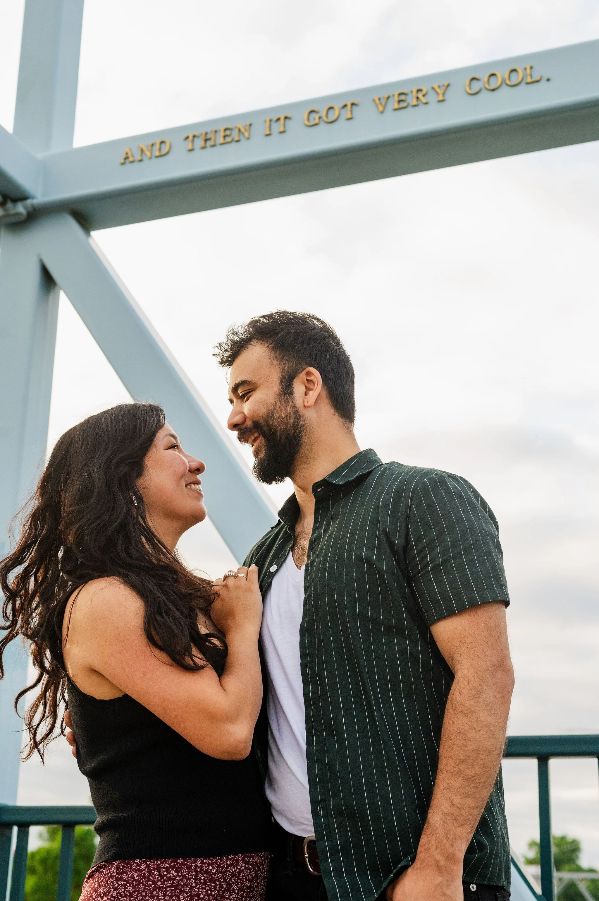 When I was planning Sonia and Peter’s engagement session with them, the initial plan was to do some fly fishing at a creek they frequent. We were so excited for this, however, the summer weather in Minnesota is fickle. After some inclement weather delays, we decided to turn our sights to the Minneapolis Sculpture Garden at the Walker Art Center. Still, rain thwarted us time and time again, delaying us to the point we doubted we were going to get a sunny session, but luck was with us! It just so happened to be the same day as Pride too! The gardens were full of people smiling, music filling the air. The sky threatened us with moody clouds, but the rain held off for the entire session. The lighting was phenomenal and I had so much fun taking these; this location just lends so much to the creative juices. Sonia and Peter also did wonderfully in front of the camera.